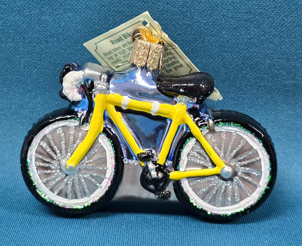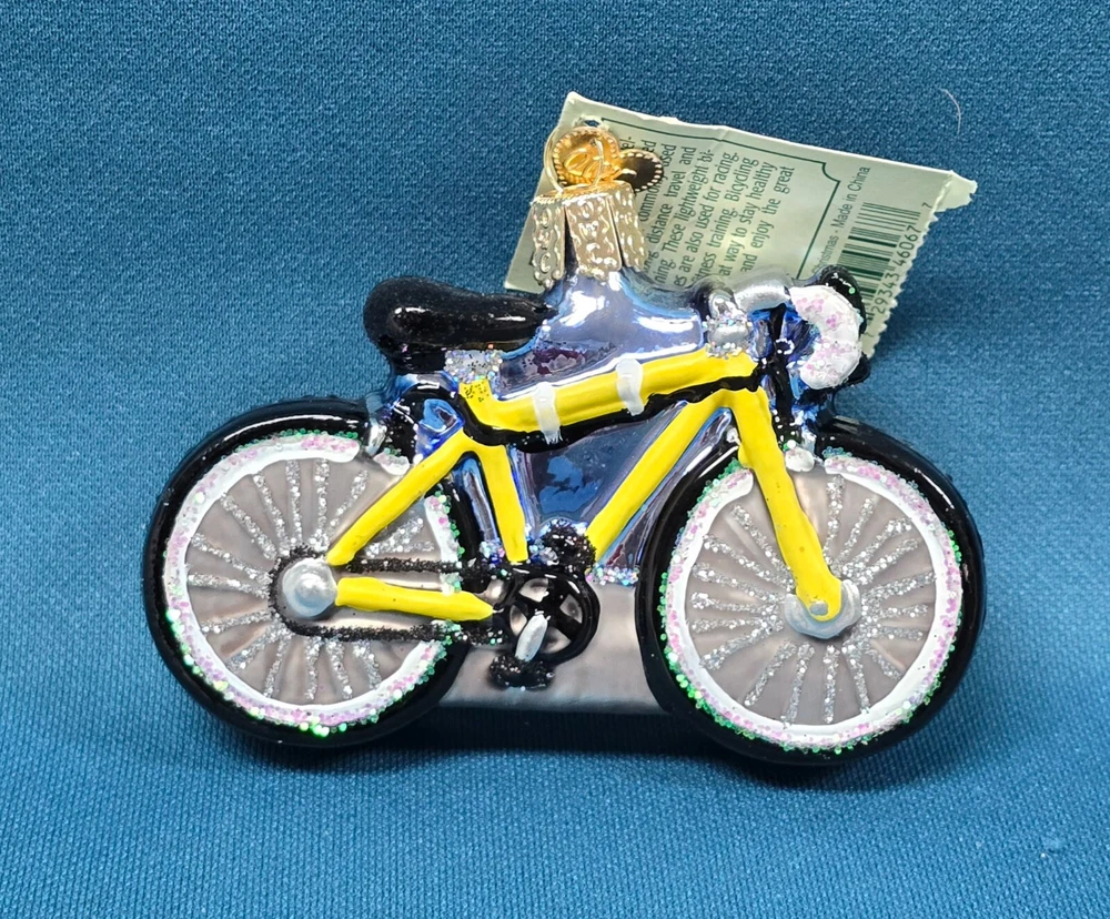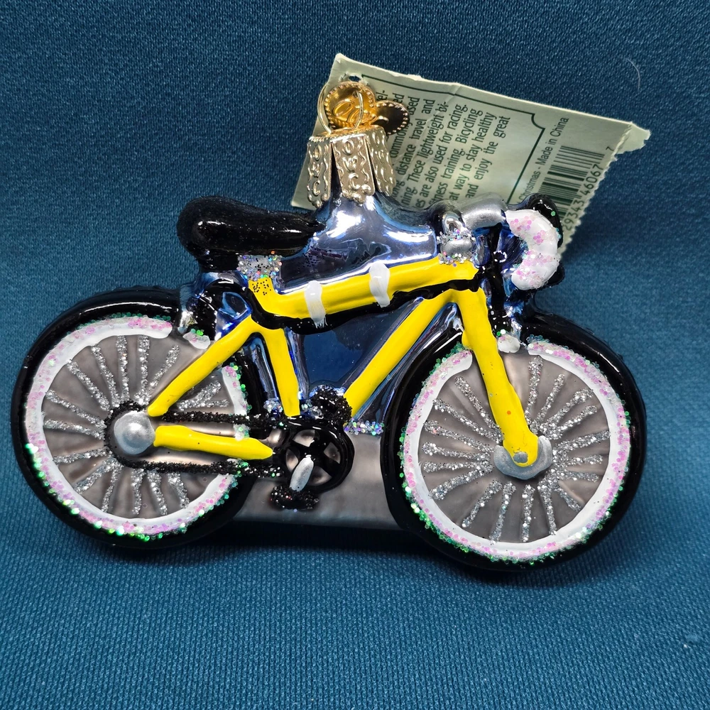 Old World Christmas Road Bike Blown Glass Ornament in Box. New with tags attached. Ornament measures about 3 3/4" x about 1" wide x about 2 1/2" tall. The box measures about 5" x 3" x 3".
