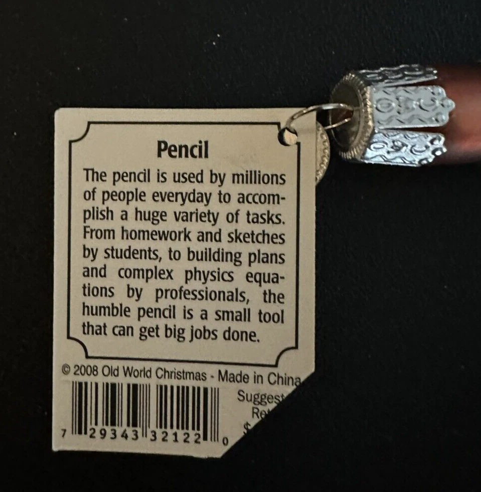 Add a touch of whimsy to your festive decor with the Old World Christmas Pencil Red Ornament. This charming glass piece, reminiscent of a classic pencil, is a delightful addition to any Christmas collection. Its vibrant red hue and unique shape make it an eye-catching decoration that is sure to spark conversation. Crafted in 2008, this ornament lacks the nostalgic appeal of vintage items but still brings a cheerful ambiance to your holiday setup. At 4 3/4 inches long, it's perfectly sized to dangle from your tree or to rest on a mantel or shelf, bringing the spirit of Christmas into your home.