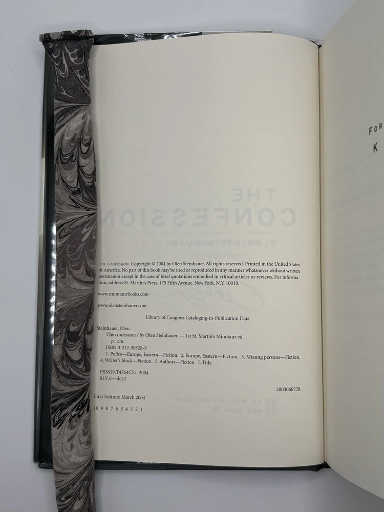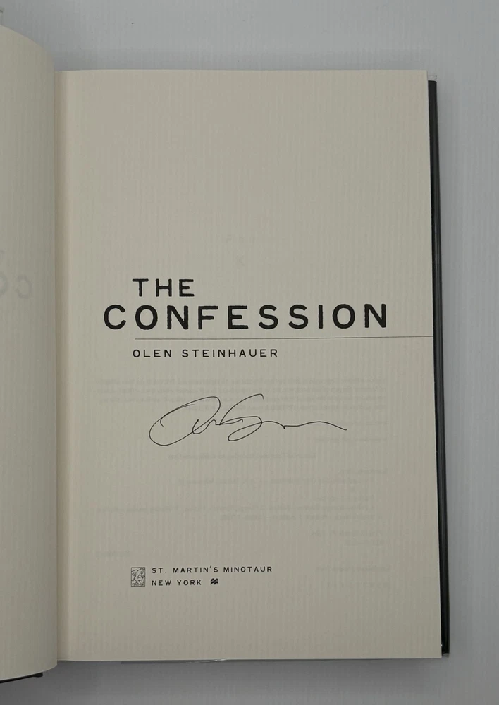 THE CONFESSION [Signed] Author: Steinhauer, Olen Title: THE CONFESSION [Signed] Publication: New York, New York: Minotaur Books, 2004 Edition: First Edition, First Printing Description: Octavo, 326 pages. In Very Good condition with Very Good condition dust jacket. Spine is black with white lettering. Dust jacket protected by mylar covering, price uncut: "$24.95" on front flap, and has mild shelving wear along spine tail. Boards have mild shelving wear along extremities, mild denting to tail joints. Signed flat by Olen Steinhauer on title page. Shelved in hallway. Seller ID: 1392269 Subject: Literature Welcome to the eBay store of Second Story Books! DC's Oldest Rare and Used Bookstore, Second Story Books operates two open shops in the Washington D.C. metropolitan area. We have an extensive internet presence and provide accredited appraisals member ASA. This listing was created by Bibliopolis.