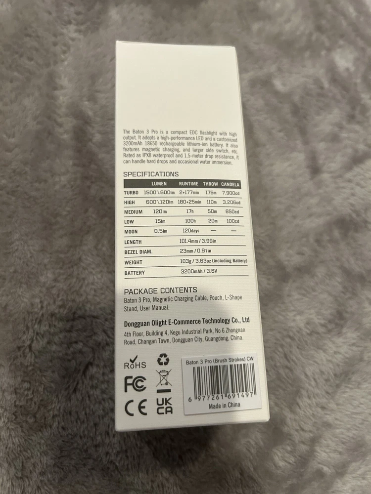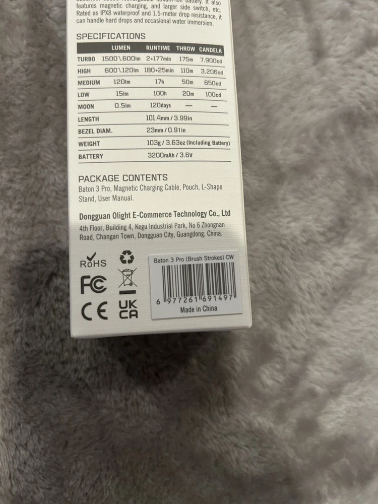 Model: Olight Baton 3 Pro Brush Strokes Cool White Color: Brush Strokes Type: Rechargeable High Performance Flashlight gtin13: 6977261691497 Lumens: 1500 Features: Rechargeable Battery Included: Yes Operating Range: 175 Meters UPC: 6977261691497 Lighting Technology: High Performance Cool White LED MPN: BATON-3-PRO-BS-CW Brand: Olight