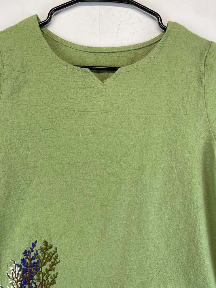 This olive green polyester shirt for women features beautiful embroidered flowers and a relaxed fit, making it perfect for any casual occasion. The short-sleeved blouse has a V-neckline and a pullover closure, making it easy to wear. It comes in a size M and is machine washable for easy care. The shirt is ideal for summer and spring seasons and is suitable for travel, party/cocktail, and outdoor activities. The bohemian and nature-inspired theme of the shirt makes it a perfect addition to any wardrobe. Made in China, this shirt is a must-have for any fashion-conscious woman. Very good preowned condition with no issues. Please see all photos. For clothing specifically, see photos for all measurements and/or any issues if applicable. Pay close attention to the measurements as the size of the garment may quite possibly be different than the actual measurement(s) due to washing, shrinkage, or stretching as these are used clothes. The size in the title is the size on the tag of the garment. See photos for measurements of actual measurements as they may differ. ALWAYS CHECK THE MEASUREMENTS IN THE PHOTOS. This will remove any questions on measurements as well as always cover the possibility of human error in the listing(s) in the case of a typo or oversight. All clothing has been washed and comes from a smoke free environment. I am available for questions. I accept or negotiate reasonable offers. Have an amazing day. Thank you.