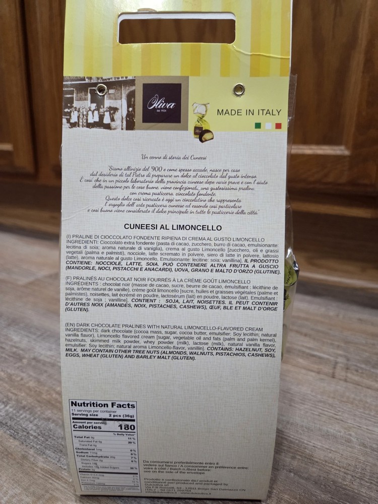 The Olivia Dolcenero Limonello Chocolate is a rich and delicious dark chocolate from Italy, weighing 250g (14.1oz). This indulgent chocolate sweet & assortment comes in a convenient bag packaging, making it easy to enjoy at home. With a fat content of 11%-20%, each serving provides 200 calories of pure chocolate bliss. Treat yourself to this delectable Italian chocolate for a luxurious taste experience.