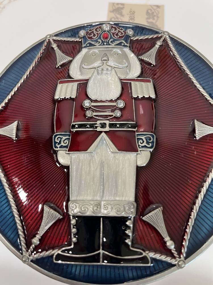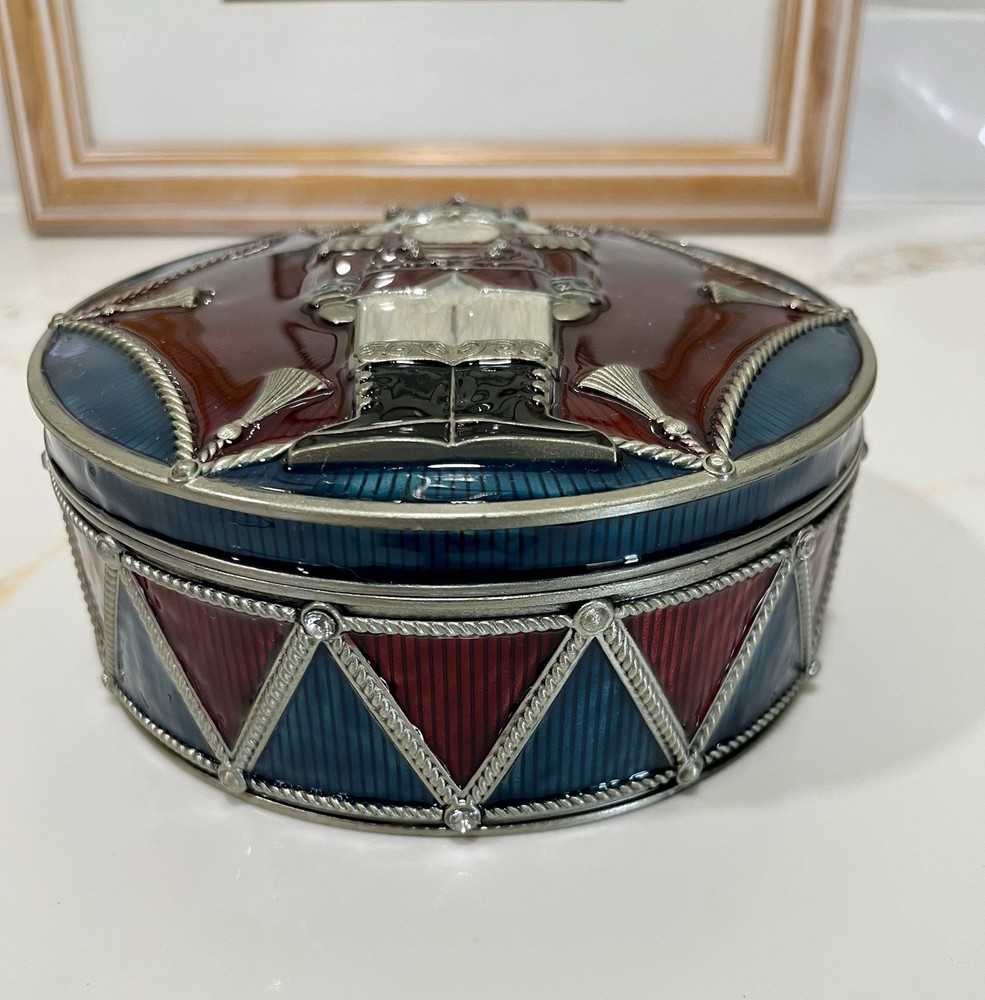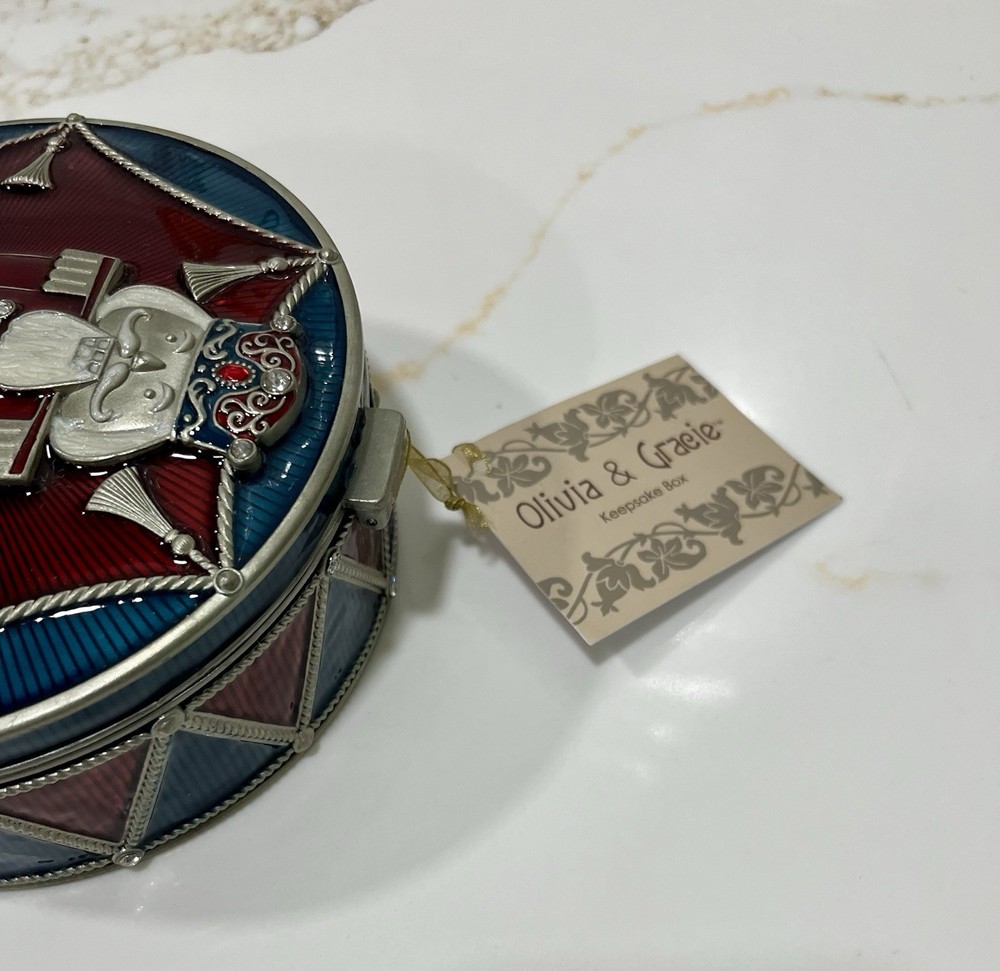 Discover the charm of the Olivia & Gracie Enameled Keepsake Box, a unique treasure that combines the whimsy of a nutcracker theme with the elegance of a mirrored finish. This large, round trinket box is crafted from durable metal, adorned with vibrant multicolor enameling that brings the festive spirit of Christmas to any setting. The box features a hinged closure, ensuring your valuables are secure while displayed. Its reflection-capturing mirrored surface adds a touch of sophistication, making it not just a holder of keepsakes but a keepsake in itself. Perfect for the holiday season or as a year-round accent piece, it celebrates the art of boxing with a timeless appeal. Please note spot on interior surface-see last photo.