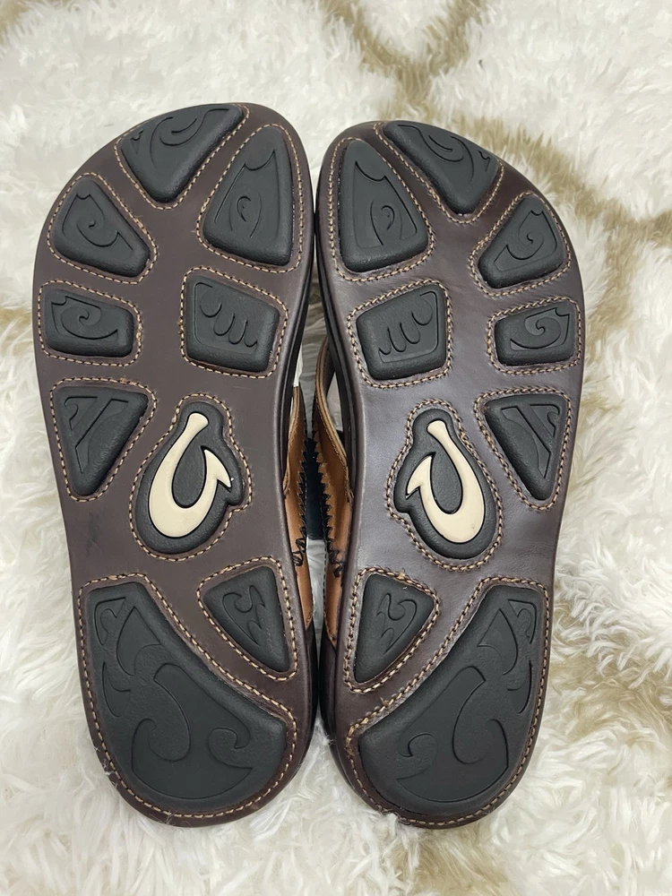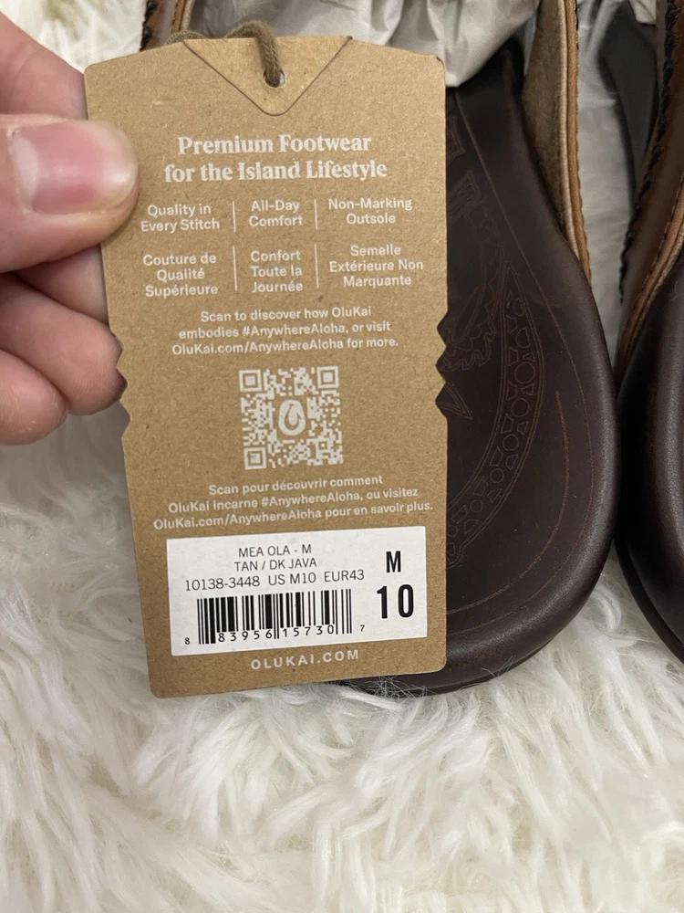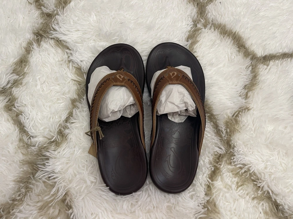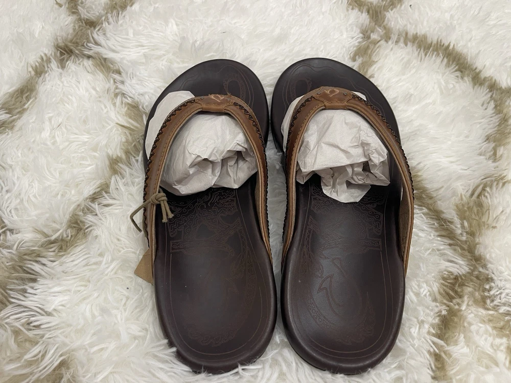 Brand New with box 100% authentic Men's size 10 Color Tan/ Dark Java All sales are final, pleae make sure it's the right size before ordering Fast shipping via UPS Ground OluKai Craftsmanship: Includes octopus-inspired laser-etched artwork on the footbed, canoe lash whipstitching, and an embroidered logo for a distinctive touch. Comfort and Fit: Features rich leather straps, a soft microfiber lining, and a comfortable handsewn toe post for a snug fit. Premium Materials: Crafted with premium full-grain leather for a luxurious and durable finish.