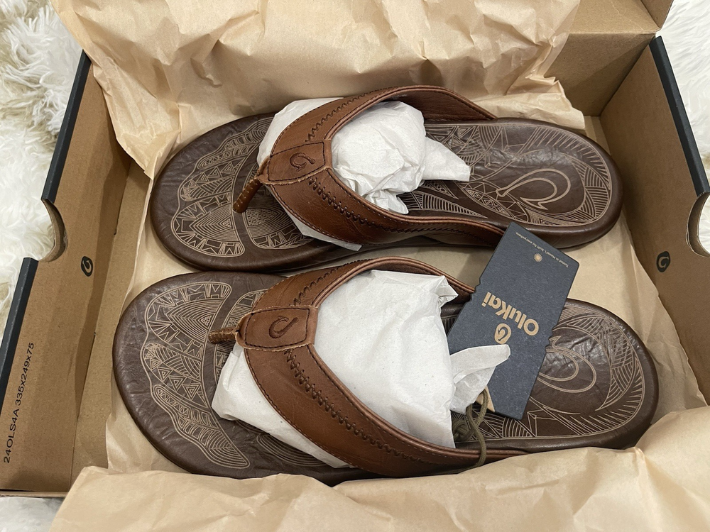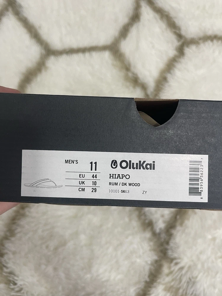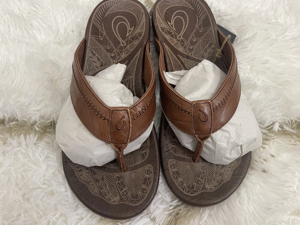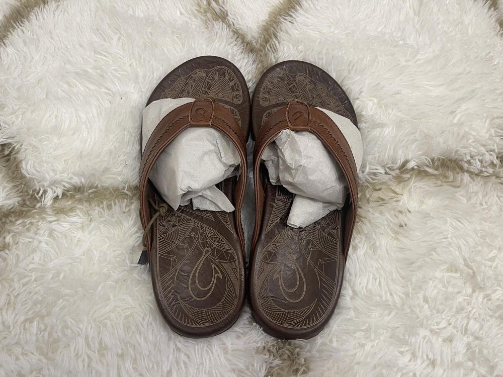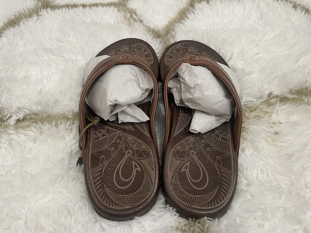 Brand New with box 100% authentic Men's size 11 Color Rum/Dark Wood All sales are final, pleae make sure it's the right size before ordering Fast shipping via UPS Ground Key Features: Premium Materials: Constructed with naturally tumbled or marbled full-grain leather, enhancing its aesthetic and durability. OluKai Craftsmanship: Features handsewn traditional whipstitching and moko tattoo artwork on the footbed, showcasing unique cultural artistry. Enhanced Traction: A full-grain leather-wrapped outsole with non-marking rubber traction pods ensures superior grip and flexibility and is perfect for various surfaces.
