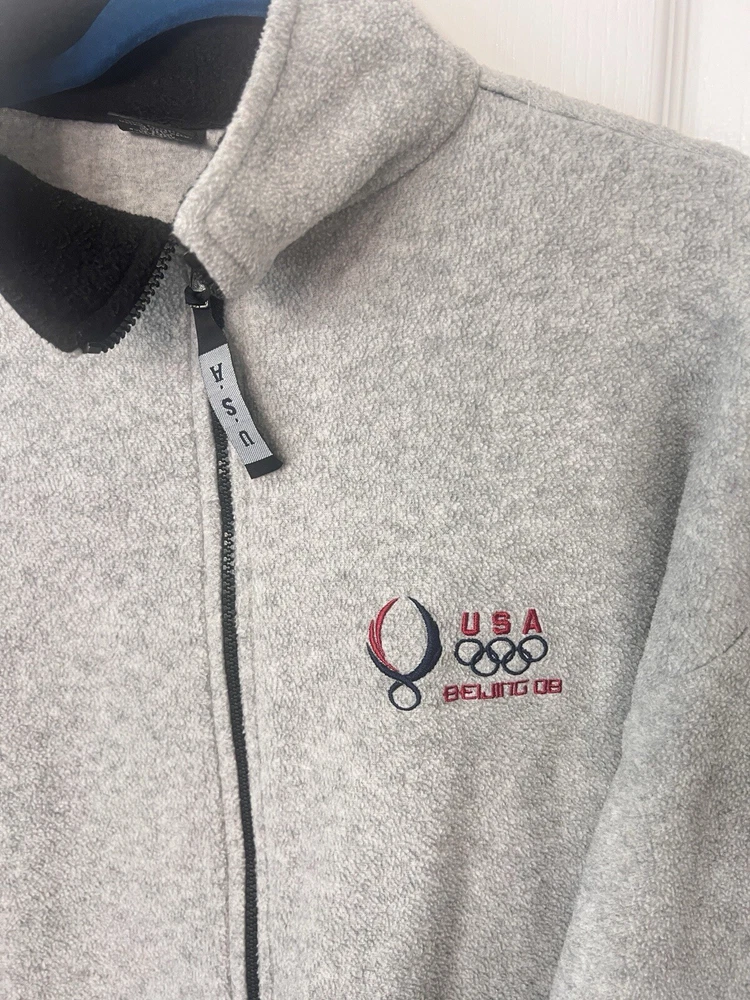 Olympic Beijing Womens Jacket. Gray Color, Long Sleeve, Hand Pockets, Zip-Up, Waist-Length Very Soft and Cozy Size: Large Great Condition! I do not know the history of this piece, please look at measurements for fit. Comes from a Pet-Free and Smoke-Free Home Please contact me if you have any questions