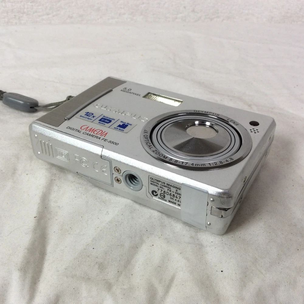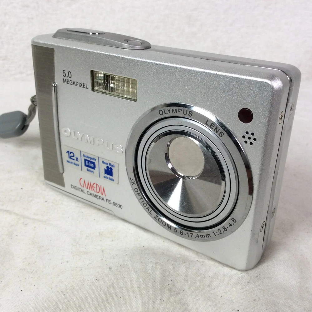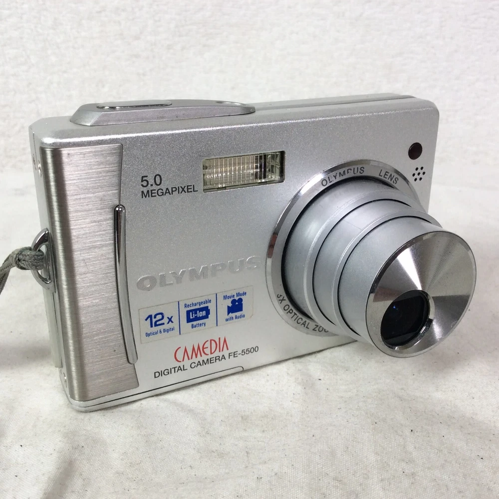 The Olympus Camedia FE-5500 Digital Camera is a compact camera with a maximum resolution of 5.0 MP and a 3x optical zoom. It features a maximum aperture of f/2.8 and a digital zoom of 4x, providing versatile shooting options. The camera comes in a sleek silver colour and includes a lithium-ion battery, charger, and original box. Other notable features include built-in flash, auto focus, dustproof design, and a tripod thread for stability during photography sessions. This camera offers convenience and functionality for capturing high-quality images. In great condition - Optics are clean and clear - Fully working - Comes with Battery, Charger, AV Cable, USB Cable and Manual - BOXED