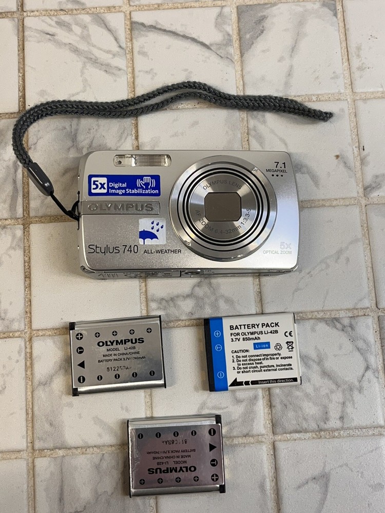 Olympus Stylus 740 7.1 MP Digital Camera Only Silver With 5X Optical Zoom Tested Tested and Working! Comes with camera case and 3 batteries No charger or SD Card Loc: 1.8