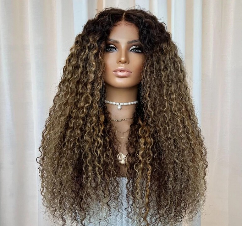 Ombre Brown Blonde Colored Highlights Human Hair Wig Deep Curly Lace Front Wigs