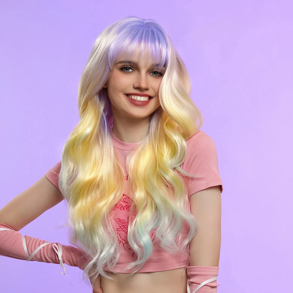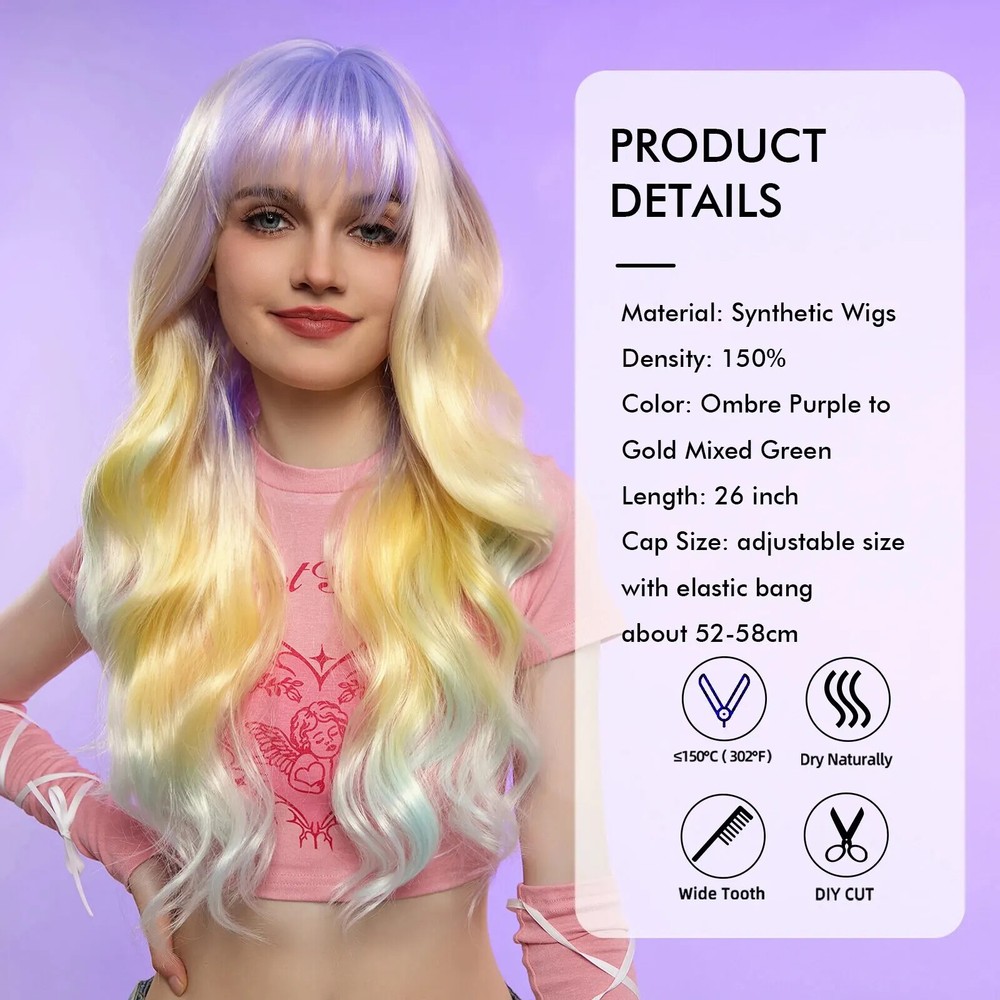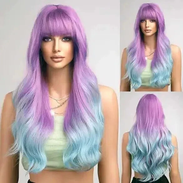 • High Temperature Fiber : Made with high temperature fiber, this wig can withstand heat styling tools and maintain its shape and texture. • Wavy Texture : The wavy texture of this wig adds volume and movement to your hair, giving you a natural and effortless look. • Ombre Purple to Gold Mixed Green Color : The unique ombre purple to gold mixed green color of this wig adds a pop of color to your look, making you stand out from the crowd. • Can Be Permed : This wig can be permed to suit your desired style, allowing you to experiment with different looks without damaging your natural hair. [Length]: 26 Inches [Unique Style]: Ombre Purple to Gold Mixed Green Color Wig Hair with Bangs [Premium Material]:Heat Resistant Fiber. we use the imported synthetic fiber to make sure our products in high quality as well,which is soft and natural looking.What's more it's allowed to trim it according to your style.The maximum temperature cannot over 180 degrees when using curling irons [Various Wearing Occasion]:It can be used all year round, whether for costume cosplay, Halloween, fashion, theme parties, wedding, dating ,daily wear, parties &fashion show and any other occasions. 【Cap】: Breathable rose net, it will make you feel comfortable when you wear it. 【Size】: Wig cap size:22 inch (It is ok for Head size from 21 inch to 23 inch )Can use hair curler to straighten or curling hair,but the temperature should below 150 degrees Celsius [Features:1.] Natural looking wigs can be use longer than one year. Basic silk cap Basic silk cap is a machine-made wefted cap construction with a skin top parting or a round part on the crown, for a more realistic-looking part. It is the most durable and affordable wig caps. A weft is a curtain of hair sewn onto the cap. The hair on these caps are pre-teased at the root to mask the cap beneath, which often gives the hair natural volume at the crown. This lightweight cap has spaces between the wefts to allow for ventilation and to keep your scalp cool. The reduction of the hand-sewn part means a reduction in the cost, making Esin basic cap wigs an affordable and quality piece. Noted: Due to our constantly updated techno, the appearance of the inner cap mesh might look differently. Wig wear 1:Place fishnet wig liner around neck 2:Coil up your hair 3:Bring wig liner up and over hair,secure in back by tying ends 4:apply your wig,adjust placement and style as desired NOTICES 1. Can be trimmed 2. Natural drying 3. Can comb it 4. Can be curled or straightened not over 150 ℃