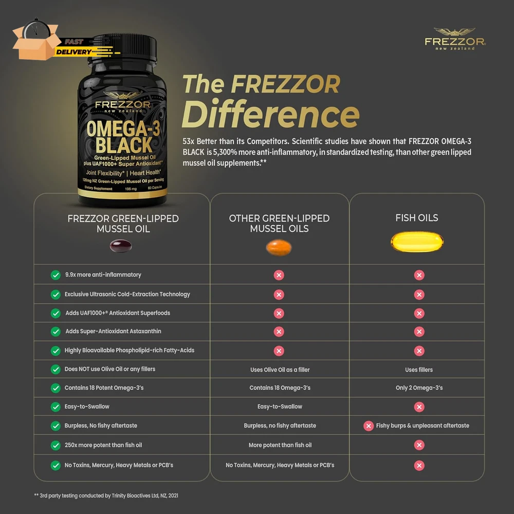 Store New Arrivals Add to Favorite View Feedback Contact Omega 3 Black for Joint Care & Comfort - New Zealand Green Lipped Musse Description Unit Count 60 Count Primary Supplement Type Green-Lipped Mussel Oil Is Discontinued By Manufacturer No Product Dimensions 1.97 x 1.97 x 3.54 inches; 1.45 ounces Item dimensions L x W x H 1.97 x 1.97 x 3.54 inches Product Benefits Joint & Muscle Support Item Weight 0.04 Kilograms Age Range (Description) Adult Package Information Bottle Flavor Natural Item Form Softgel Size 60 Count (Pack of 1) JOINT COMFORT: Independently tested and proven to be the most potent joint health supplement in its class. In recent a scientific study, FREZZOR OMEGA-3 BLACK Capsules was shown to be 53 TIMES more EFFECTIVE than the other mussel oil competitors or other essential fatty acids supplements. SMALL BUT MIGHTY: Easy to swallow soft-gel supplement for Joint Comfort and Mobility. No unpleasant fish burps, gluten-free, GMO-free. Our greenlip mussel supplements are much smaller than bulky fish oil capsules, easier to consume and are significantly more potent. INDUSTRY LEADING: We achieve this improved effectiveness with our new ultrasonic, cold-extraction process (patent-pending), which is more efficient at extracting the essential bioactive compounds. We control the entire extraction and production process of the green lipped mussel extract; from sustainably farmed New Zealand mussels to the extraction of green lipped mussel oil. The greenshell mussel is found only in New Zealand. INDUSTRY LEADERSHIP: The Founder of FREZZOR Inc, Noel Turner is the Pioneer of New Zealand's Green-Lipped Mussel Industry with over 50 years of experience in the processing and extraction of NZ Green-Lipped Mussel. Noel personally ensures you get the best quality and most biologically active green lipped mussel oil to assist with joint comfort and mobility. Studies show that on average, it takes about 3 months for levels of omega-3's to reach a balance within the body. If after 3 months, FREZZOR OMEGA-3 BLACK hasn't worked, email us, send us the empty bottles and we will provide you a full refund. We have full confidence in the effectiveness of our product that we stand behind it 100%; we want you to share in our experiance and buy with confidence. Please keep product under 90 degrees fahrenheit or 32 degrees celsius. MOVEMENT & JOINT MOBILITY. It can be hard to maintain an active lifestyle with the demands of modern living. This lack of exercise and physical activity places stress on joints and lessens our mobility. FREZZOR Omega-3 Black greatly assists with increasing joint mobility to allow you to do the activities you have been wanting to do for years. HEALTHY INFLAMMATION MANAGEMENT. A healthy immune system with a controlled inflammatory response is essential to our survival. Still, this process sometimes spirals out of control and needs our help. FREZZOR Omega-3 Black contains one of the most powerful, natural anti-inflammatories on the planet. - we have filed a patent because it is that good! INNER FITNESS & HEALTHY GUT. A hectic, high-pressure lifestyle impacts the quality of our food and overall gut health, leading to low energy and dysfunctional wellbeing. Optimal health generally starts with a healthy gut and well-balanced gut bacteria. FREZZOR Omega-3 Black, combined with whole organic food, clean water, and regular exercise, helps restore optimal health and lifts energy. ABOUT US We offer the best prices around on high quality products. Our E-store includes media such as books, movies, music and games while offering electronics, toys, sporting apparel, clothing, tools, general home, garden items and more. SHIPPING We are always working hard to ensure your package arrives as soon as possible. Please understand that some factors like weather, high postal traffic, and the performance of shipping companies are outside of our control. We offer free shipping to the lower 48 states and ship within 2 business days of payment, usually sooner. We do not accept P.O. Boxes. Please provide a physical address. For shipping outside of the continental USA, we only use eBay's Global Shipping Program.The item is shipped to KY and then sent to the rest of the world. International customers are responsible for all duties and taxes. Continue to check out in order to calculate costs for shipping the item to your country. Messages regarding eBay's Global Shipping Program MUST be directed at eBay EXCLUSIVELY. RETURNS We offer a 30-Day Return Policy on items which you are not completely satisfied with. You have the option for a full-refund or an exchange of the item. No returns are available on items shipped outside of the USA. PAYMENT We accept PayPal. CONTACT US This page content is yet to come Please ad us to your favorite seller and visit again later Thank You CUSTOMER SATISFACTION We try our very best to make sure every customer is completely satisfied. If there's a problem, message us! We're happy to help. WE ACCEPT Copyright © 2021 AutoDS. | All Rights Reserved