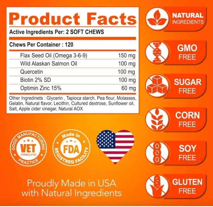 Omega 3 for Dogs Skin and Coat Supplement Fish Oil Chews Allergy and Relief About this item Skin & Coat Supplement for Dogs: Our dog fish oil supplements are an effective way to support your dog's health, with a nutrient-dense formula that includes premium fish oil for dogs Healthy Skin & Shiny Coat: Achieve a healthy skin and shiny coat with our dog omega 3 supplement. It provides essential vitamins and fatty acids that promote soft, shiny, and healthy coats and skin. Itch & Allergy Relief: Our dog shedding supplement is designed to relieve allergies in dogs. It effectively tackles hot spots, dry itchy skin, irritation, providing relief & comfort for your dog Premium Natural Ingredients Give Results: No Added Sugar, Wheat, Corn, Gmo, Preservatives. We are committed to using only best ingredients that deliver results in our fish oil for dogs skin and coat Made in The U.S.A, Vet Formulated: Our dog vitamins for skin and coat allergies are made in the USA and formulated by Vets in an FDA-registered facility that meets the highest quality standards