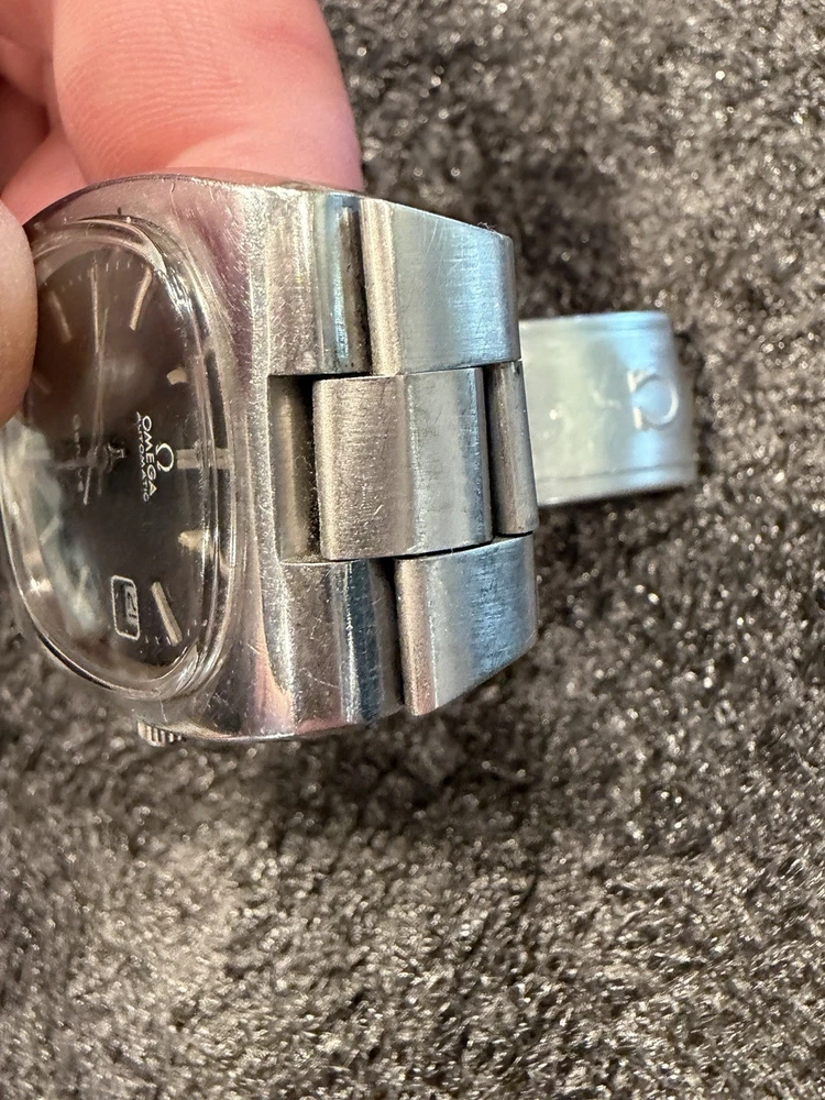 The Omega Geneve Automatic Date 36mm Black Dial 1970's Men's Watch is a vintage timepiece with a classic design featuring a stainless steel case and baton indexes. The watch has a smooth silver bezel and a black dial, giving it a timeless and elegant look. With its mechanical automatic movement and 36mm case size, this Omega watch is perfect for any occasion and is sure to add a touch of sophistication to any outfit. The stainless steel bracelet band adds durability and style to this iconic timepiece. Extra link on band extends fit up to 8 1/4 inch wrist. ( link is already added )
