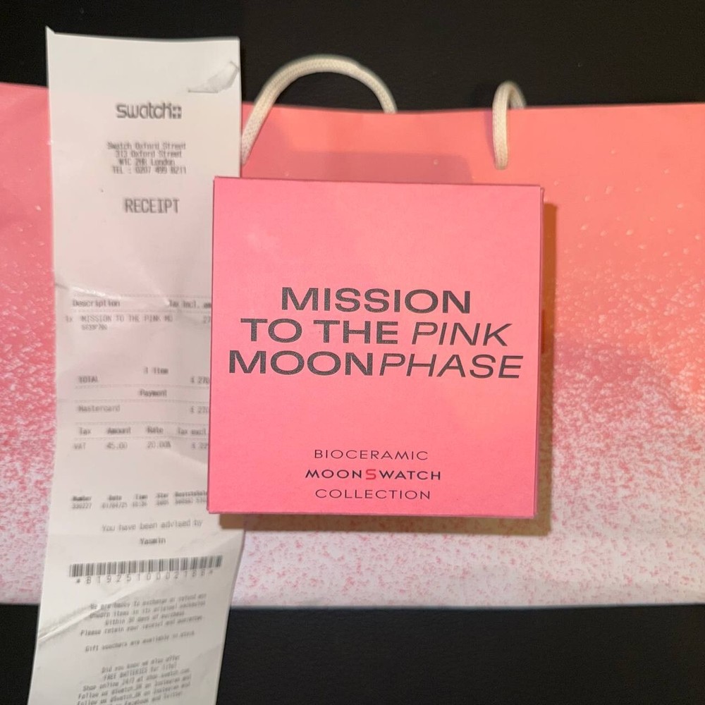 IN HAND: OMEGA X Swatch MoonSwatch PINK Moonphase ๐Ÿ’–๐ŸŒ™ - SO33P700 ๐ŸŒ• Exclusive & EXTREMELY Limited! ๐Ÿšจ NOW IN HAND โ€“ READY TO SHIP IMMEDIATELY! ๐Ÿšจ Own the iconic Swatch Bioceramic MoonSwatch โ€“ Mission to the PINK Moonphase (SO33P700) , now IN HAND and available to ship RIGHT NOW . This exclusive and extremely limited edition was only released randomly between April 1st โ€“ 15th at selected Swatch stores worldwide and celebrates the mystical glow of April's Pink Moon with a poetic Moonphase complication โ€” a first in the MoonSwatch line. ๐Ÿ’–๐ŸŒธ Key Features: Official OMEGA x Swatch Collaboration โ€“ Model: SO33P700 Pink Bioceramic Case, Crown & Pushers โ€“ Lightweight and futuristic Black & Silver-Pink Opaline Dial โ€“ Elegantly unique Moonphase Subdial at 2 oโ€™clock โ€“ Rotating twin pink moons Pink Super-LumiNovaยฎ โ€“ Glows vividly pink in the dark Black Bioceramic Bezel โ€“ With white pulsometer scale Heart-Embossed Push Button โ€“ Pulsometer inspired Size: 42mm Diameter | 13.75mm Thickness | 47.30mm Lug-to-Lug Strap: Pink Velcroยฎ with White Stitching & Pink Bioceramic Loop Movement: Quartz Chronograph with Moonphase Indicator Water Resistance: 3 BAR UV Reactive Detail โ€“ Secret pink effect on the moonphase mask Pink Moon Battery Cover โ€“ Radiant spectrum design ๐Ÿ“ฆ What Youโ€™re Getting: โœ… 100% Authentic โ€“ Bought directly from Swatch โœ… Factory-Sealed, Brand New Condition โœ… Extremely Limited April 2025 Release โœ… IN HAND & Ready for Immediate Dispatch โœ… Tracked & Fully Insured Shipping โœ… Carefully Packaged for Protection โœ… ๐Ÿงพ Includes All Original Receipts, Papers & 2-Year Swatch Warranty ๐ŸŒ™๐Ÿ’– This is your chance to secure the most poetic and collectible MoonSwatch ever made. Availability was extremely limited , released at random locations only during a 15-day window. Donโ€™t miss your opportunity to own this extraordinary tribute to the Pink Moon. ๐ŸŒ•๐Ÿ’— Mission to the Pink Moonphase wonโ€™t come around again โ€“ grab yours while you can!