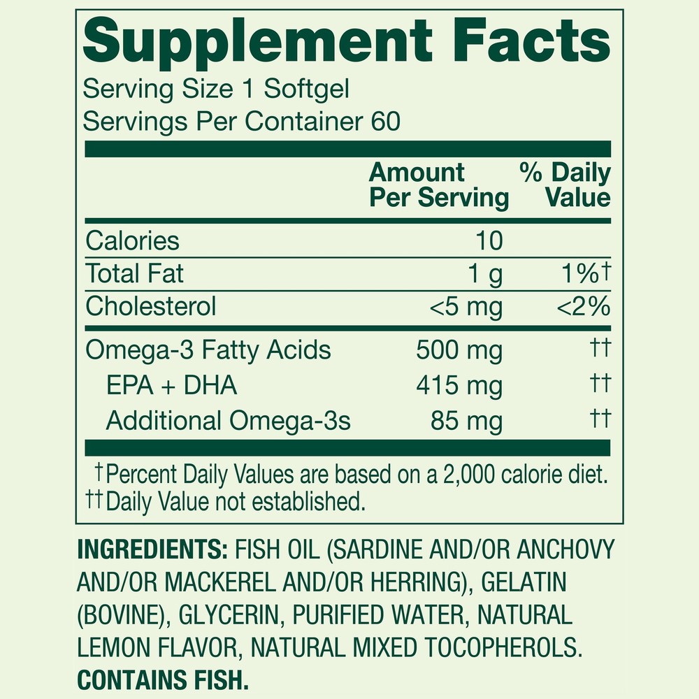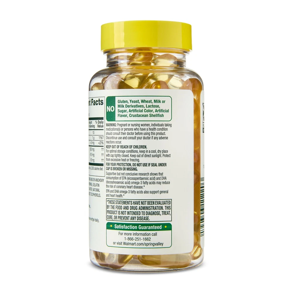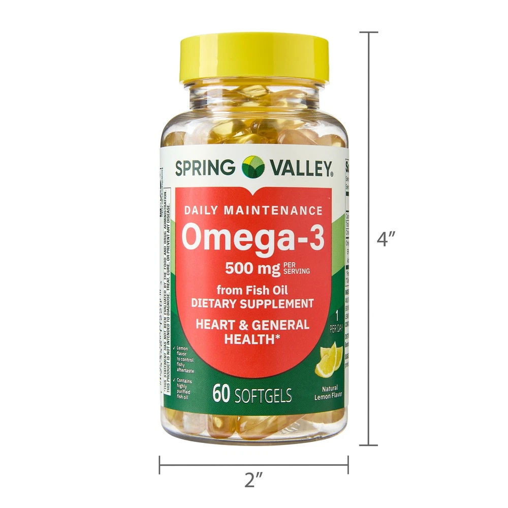 Spring Valley Daily Maintenance Omega-3 Fish Oil Softgels are an easy and natural way to replenish the healthy fatty acids your body needs. These softgels are free of gluten, yeast, wheat, milk or milk derivatives, lactose, sugar, artificial colors or flavors, and crustacean shellfish. Use Spring Valley Daily Maintenance Omega-3 Fish Oil Softgels Spring Valley Daily Maintenance Omega-3 Fish Oil Softgels, Lemon Flavor, 500 mg, 60 Softgels Daily Maintenance Omega-3s from highly purified fish oil Each softgel contains 500 mg of omega-3 fatty acids Take one softgel daily Natural lemon flavor for effective fishy odor control No gluten, yeast, wheat, milk or milk derivatives, lactose, sugar, or crustacean shellfish No artificial flavors or colors 60 softgels per bottle, tamper-evident
