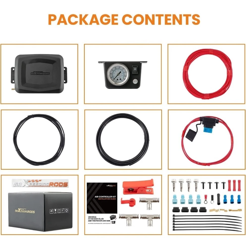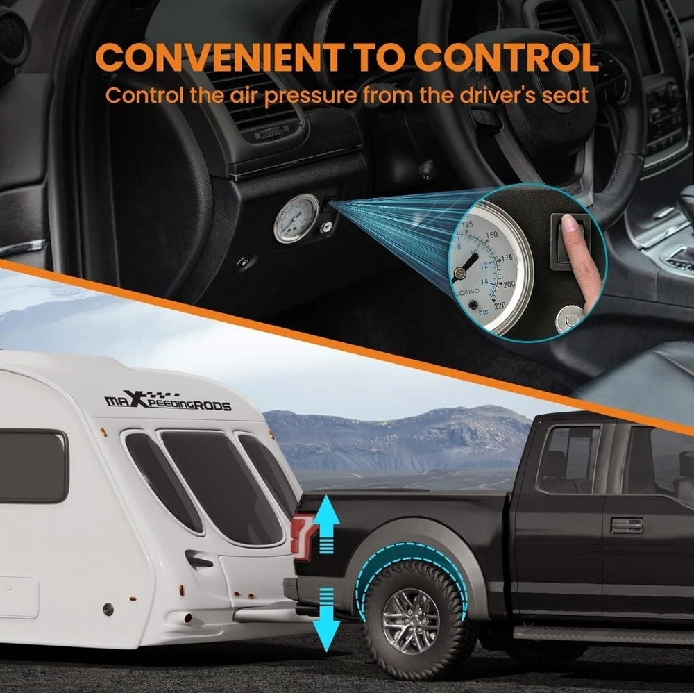 Condition: Open box maXpeedingrods On Board Air Compressor System Universal Air Spring Compressor Kit with Gauge Air Line T Fittings for Trucks Vans 【Enjoy the Ride】When your truck carries a heavy load or tows a trailer that requires additional ground clearance, this single path system will equally distribute air pressure to the air springs, you can enjoy a smooth ride and say goodbye to complicated manual adjusting. 【Easy to Air Up】This universal air spring controller kit features a durable on-board compressor which is capable of a max air pressure of 100 psi, it will easily pump up your air springs in a minute or two. The recommended working pressure is 5-70 psi. 【Easy to Use】The compressor system doesn't require an air tank, offering great convenience to adjust the bags pressure on the go just with the push of the gauge button, allows you to fill both bags at the same time without leaving the cab. 【Easy to Install】The compressor kit comes with a compact compressor, an analog gauge, enough air line, installation manual and complete mounting hardware, meaning that you can effortlessly install the kit in hours. It will be better protected when mounted under your vehicle.