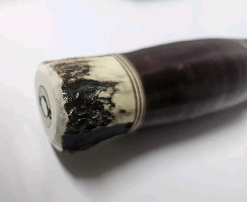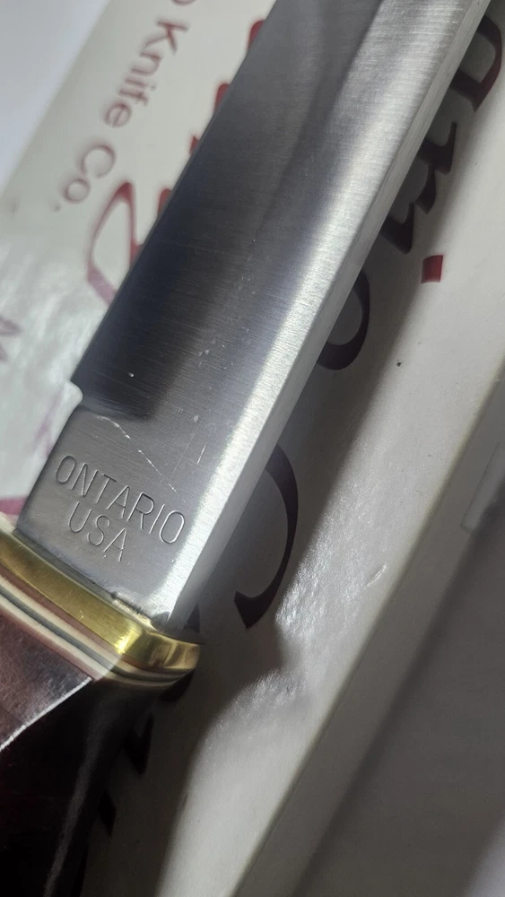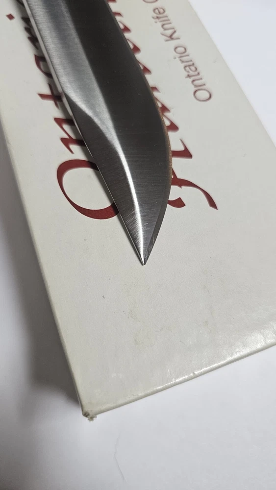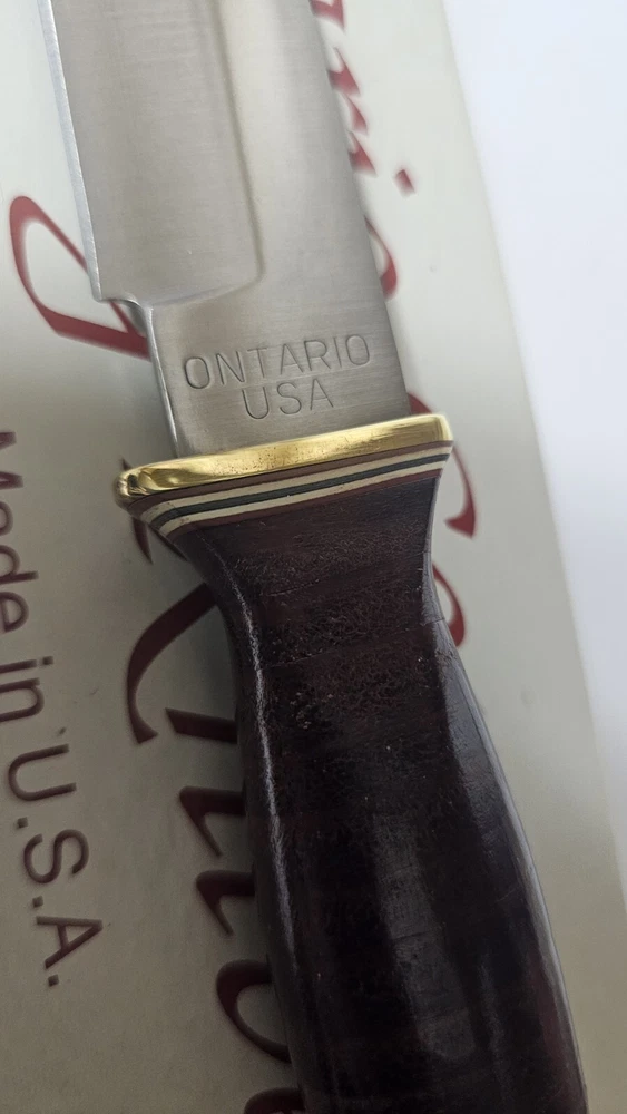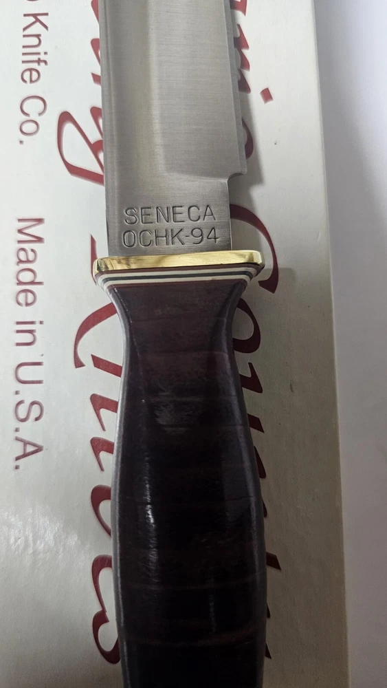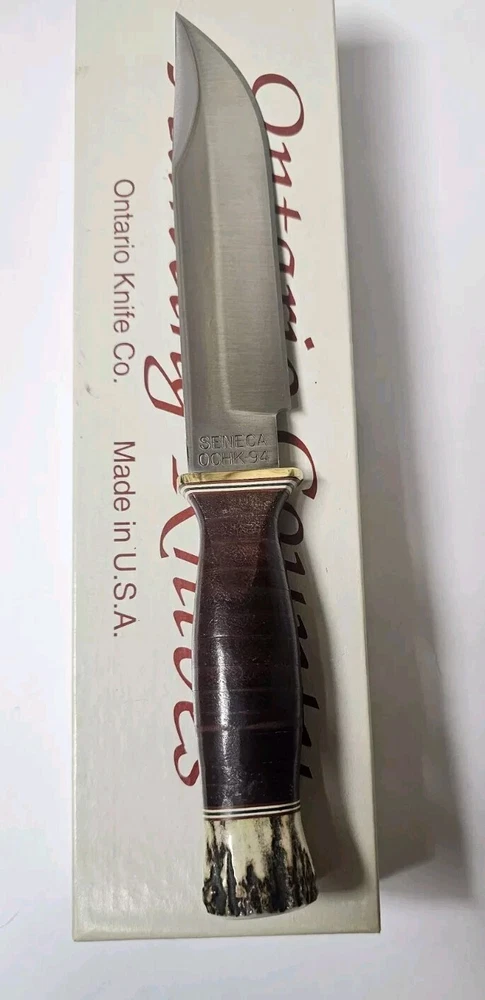 Ontario fixed blade knife Model Seneca OCHK-94 Cayuga Around 10½ overall 6" blade Razor sharp Never used carried or sharpened Leather with stag pommel Comes with original box Comes with sheath but seems like it's for the smaller model Please look at the photos carefully to see what you are getting. No refunds sorry and thanks for looking.