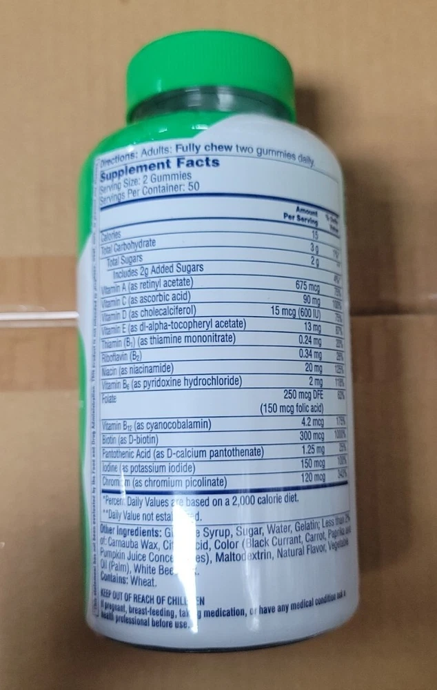 Number of Pills:100gtin13:016500598275Main Purpose:Energy Support, Rejuvenate and Support Energy & Overall DigestiveCountry/Region of Manufacture:GermanyWhen to Take:AnytimeExpiration Date:12/2024Features:No Artificial Colors, No Artificial Flavors, No Artificial Sweeteners, No High Fructose Corn Syrup, Contains WheatIngredients:MultivitaminUPC:016500598275Nutrition Facts Label:YesType:MultivitaminFormulation:GummyDepartment:UnisexBrand:One A DayActive Ingredients:Vitamins