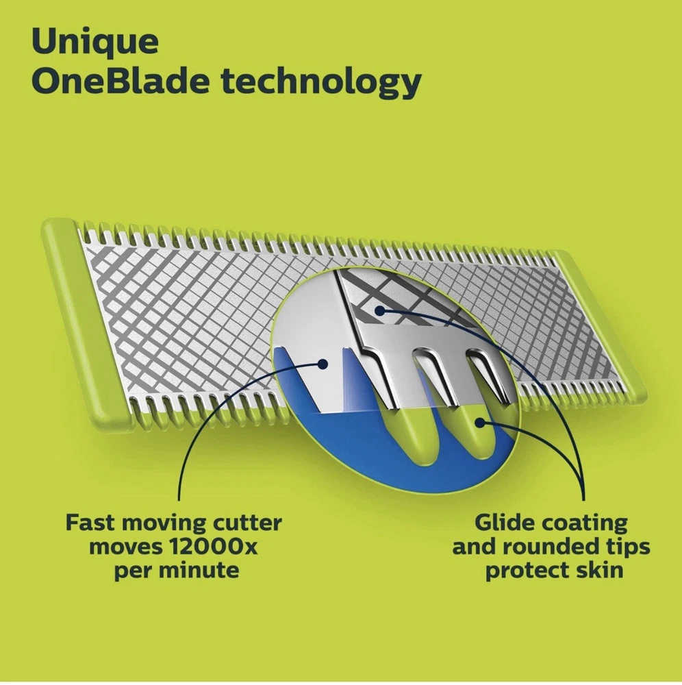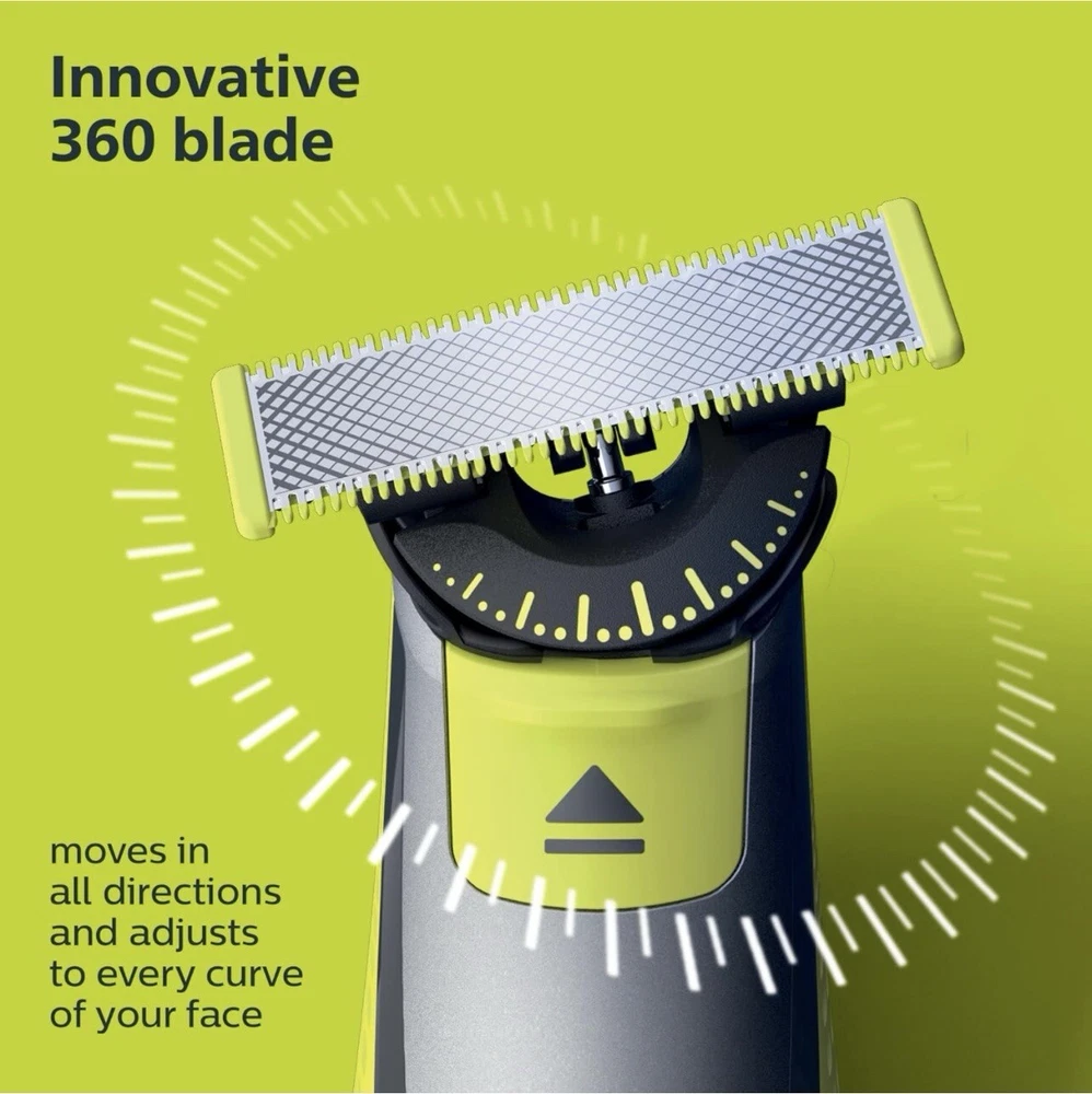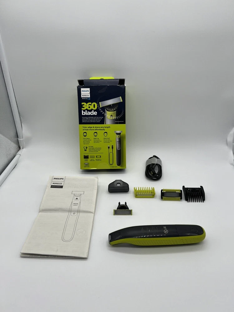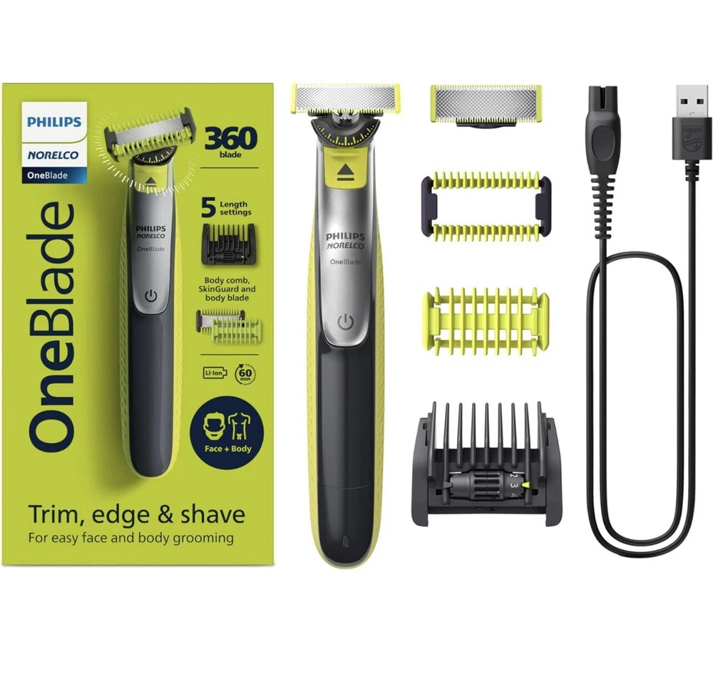 One Blade. philips Norelco 360blade 5length settings Open Box. Item: S1(9) Rechargeable OneBlade 360 Face plus Body can trim, edge, and shave any length of hair. Shave is not too close so your skin stays comfortable. The innovative 360 Blade can flex in all directions to adjust to the curves of your face. The design enables constant skin contact and control. Includes 2 blades, 1 360 blade for your face and 1 blade for your body. Use wet or dry, with or without foam. Click-on skin guard for extra protection on sensitive areas, even below the belt. Includes a 5-in-1 stubble comb plus 1 body comb for an even trim on face or body USB-A charging cable included (wall power adapter not included). Subscribe and Save on Philips Norelco OneBlade 360 replacement blades and save up to 15 percent . Includes: 1 handle, 1 360 blade for face, 1 blade for body, 1 5-in-1 comb for face, 1 skin guard for body, 1 body comb, 1 USB-A charging cord (wall power adapter not included), 1 protective cap. 2023 Men’s Health Award winner for “Best Electric Razor”