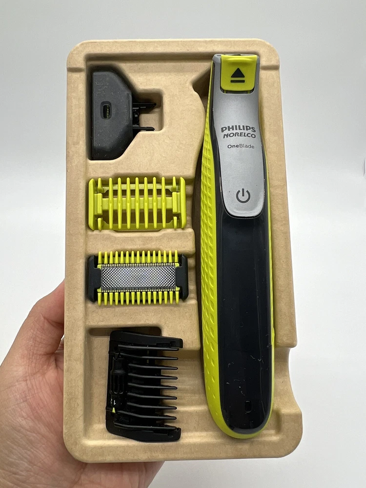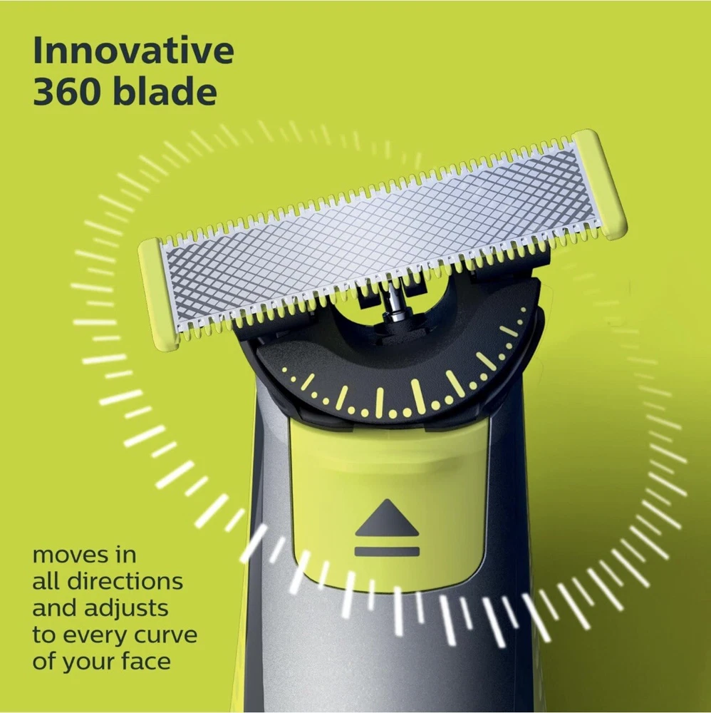 One Blade. philips Norelco 360blade 5length settings Q3(21) Used, tested still in good condition. Rechargeable OneBlade 360 Face plus Body can trim, edge, and shave any length of hair. Shave is not too close so your skin stays comfortable. The innovative 360 Blade can flex in all directions to adjust to the curves of your face. The design enables constant skin contact and control. Includes 2 blades, 1 360 blade for your face and 1 blade for your body. Use wet or dry, with or without foam. Click-on skin guard for extra protection on sensitive areas, even below the belt. Includes a 5-in-1 stubble comb plus 1 body comb for an even trim on face or body USB-A charging cable included (wall power adapter not included). Subscribe and Save on Philips Norelco OneBlade 360 replacement blades and save up to 15 percent . Includes: 1 handle, 1 360 blade for face, 1 blade for body, 1 5-in-1 comb for face, 1 skin guard for body, 1 body comb, 1 USB-A charging cord (wall power adapter not included), 1 protective cap. 2023 Men’s Health Award winner for “Best Electric Razor”