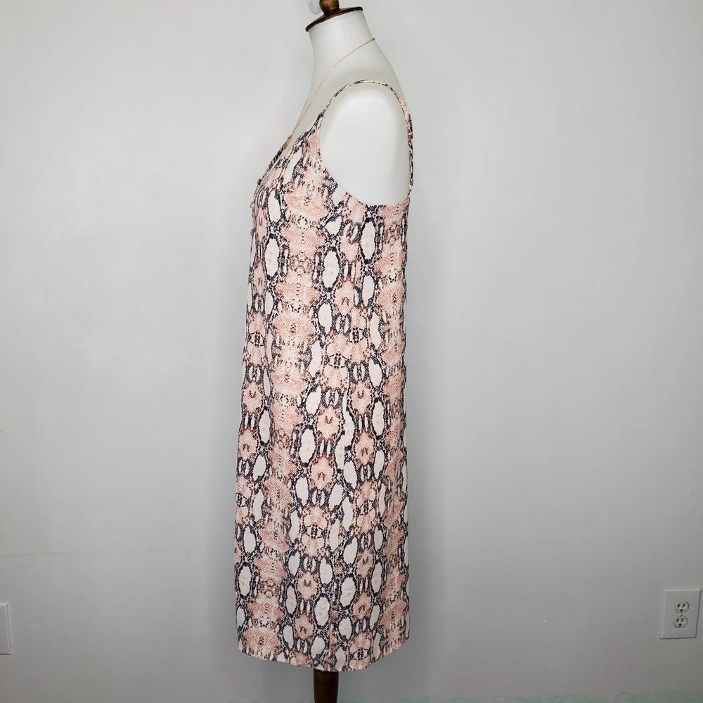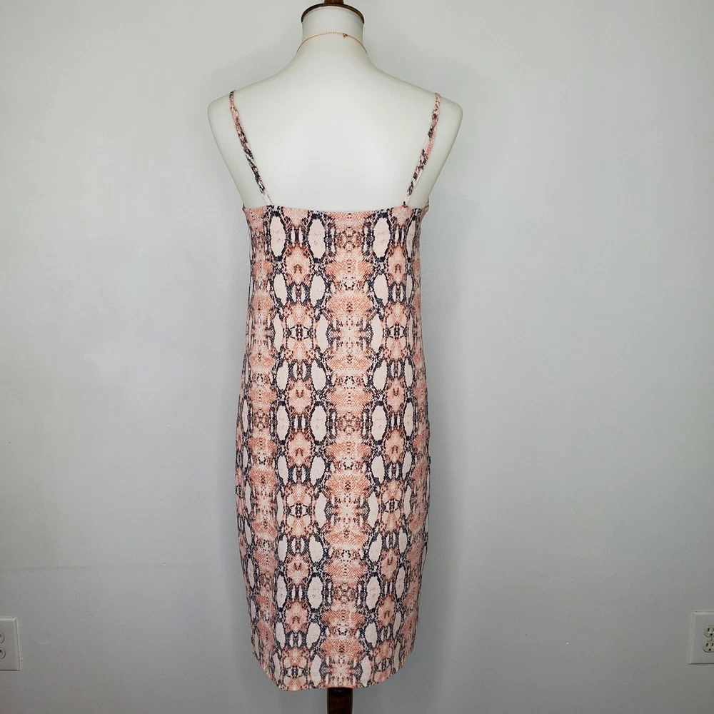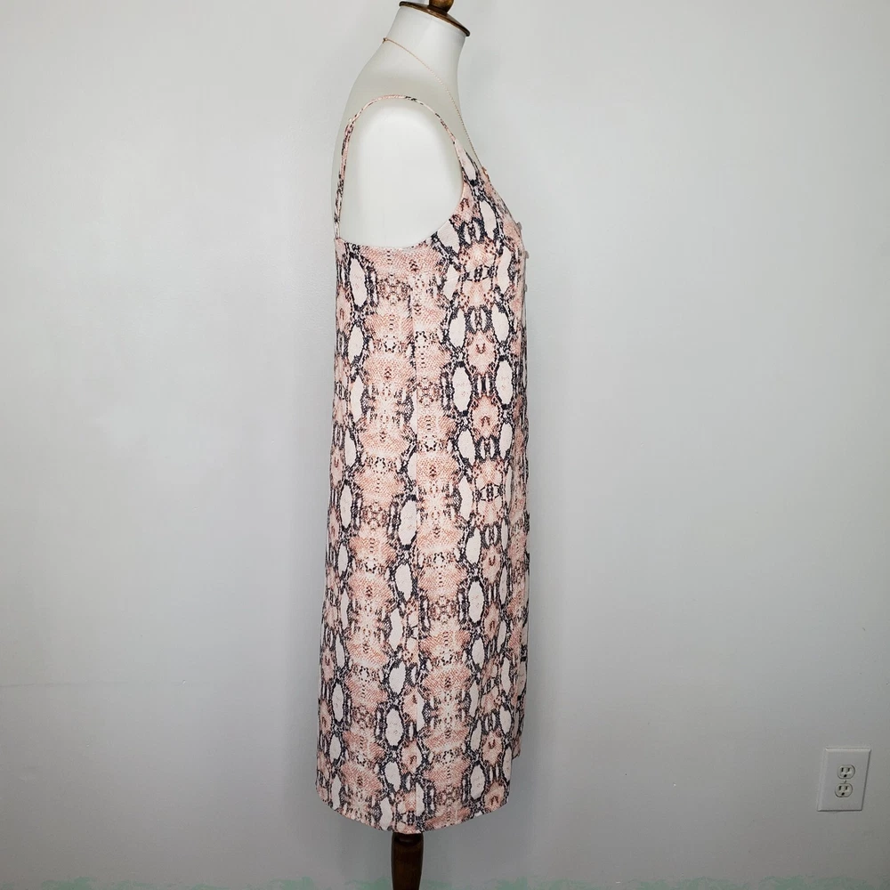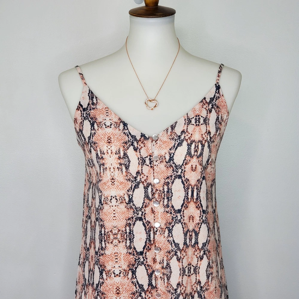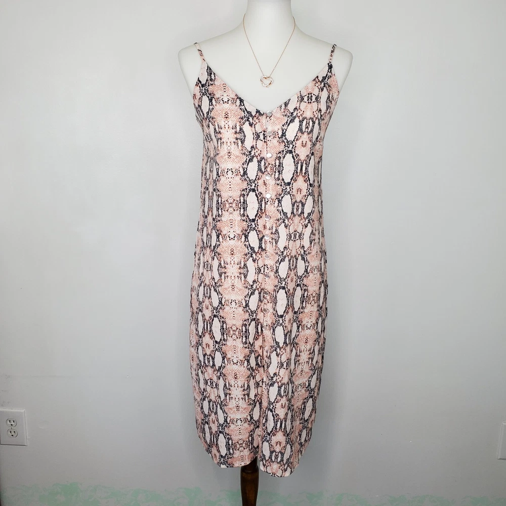 One Clothing Los Angeles Snakeskin Sleeveless Button Front Dress Size S Pink gray cream reptile print dress Adjustable spaghetti straps Button up front w/material panel behind buttons Textured 3/4 lined Chest darts Wear alone or layer Summer dress Dress up or down Not stretchy Pictured on woman's Small dress form Notice: Color may differ from your computer, phone or device display Buttoned relaxed flat lay measurements are approximate, fit not guaranteed. Pit to pit: 17" Back Length down center: 31" Width front side to side at 6th button: 18" AA805B M52422 9106 **7.2oz 50424 EBMP1 snakeskin print dress reptile print dress spaghetti straps summer dress