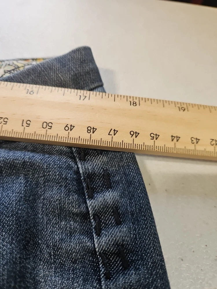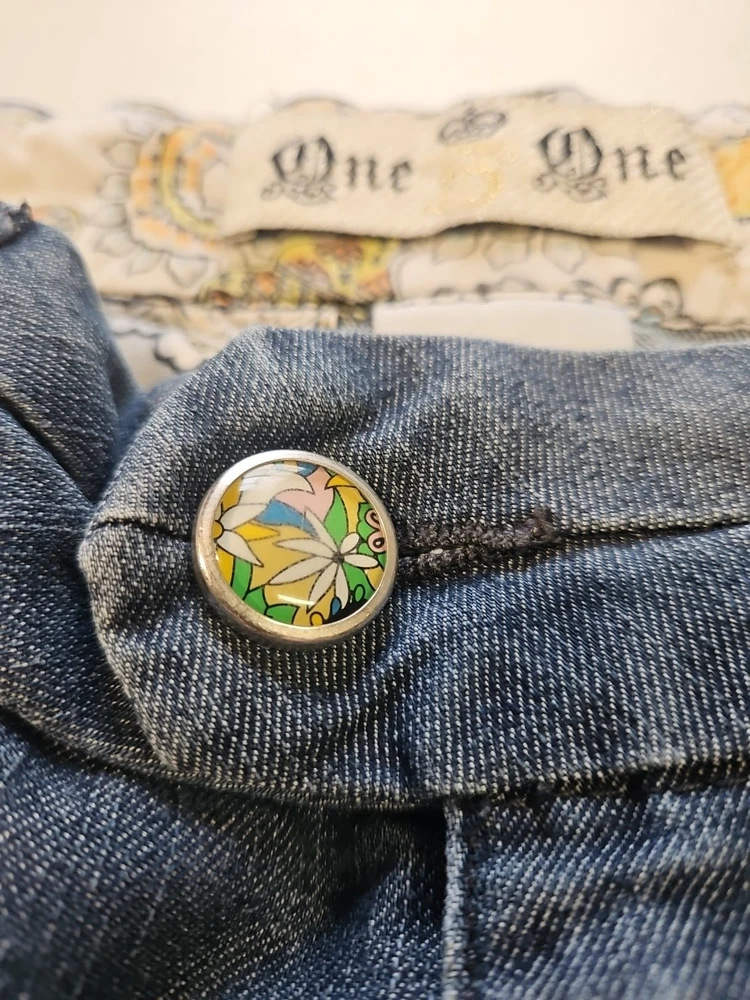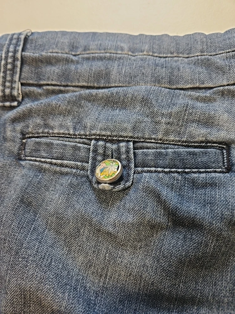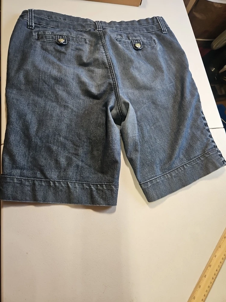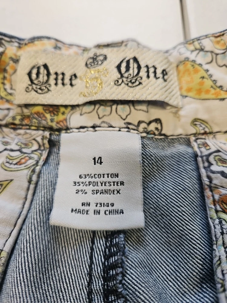 Elevate your summer wardrobe with these stylish one one jean shorts. The whip stitch detailing and floral buttons add a touch of Hawaii and American style to your look. These shorts are perfect for travel and casual occasions, and the stretchy polyester, spandex, and cotton material ensures a comfortable fit. Machine washable for easy care, these denim shorts come in a size 14 and have a Bermuda style. The blue color and stitch accents make them a chic addition to any outfit. Whether you're celebrating a birthday or just lounging around, these shorts are a must-have for any fashion-forward woman. Shorts are in great shape. From a pet and smoke free home.