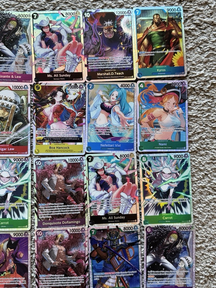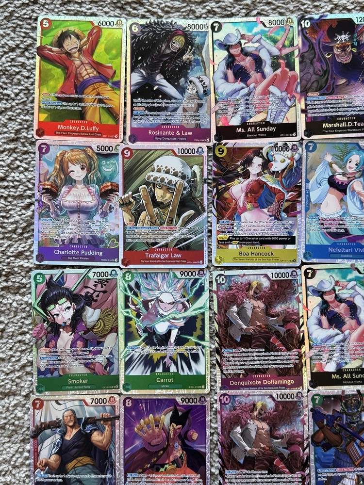 This One Piece 20 SR Card Lot features cards of popular characters such as Luffy, Nami, Boa, and Carrot from the One Piece CCG. Manufactured by Bandai, these English-language cards have a foil finish and are in excellent condition. With a total of 20 standard-sized cards included, this collection is perfect for collectors and fans of the One Piece series looking to enhance their deck.