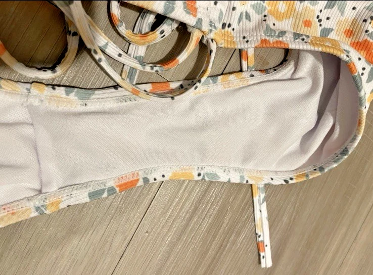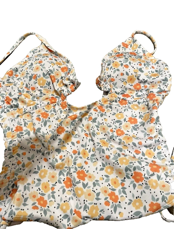 This swimsuit is pre-owned and has no visible signs of wear. If you would like measurements or have any questions, please feel free to send me a message. Size XL Beautiful floral pattern Unique hollow out design Comfortable polyester blend material Machine washable for easy care Adjustable straps Padded feature for added comfort and support