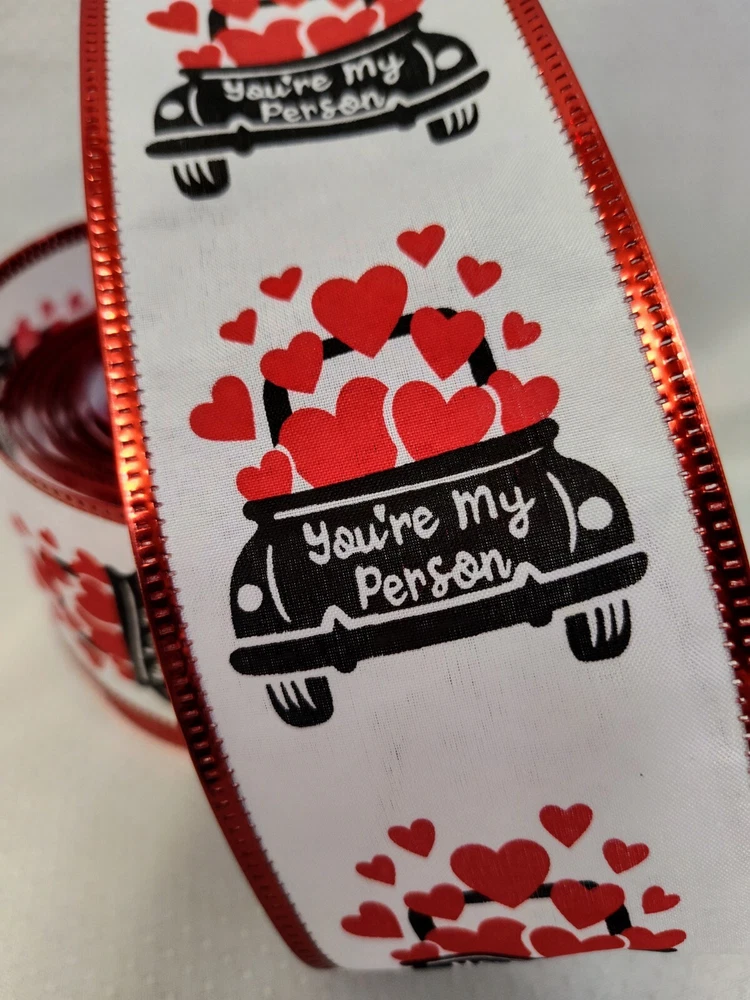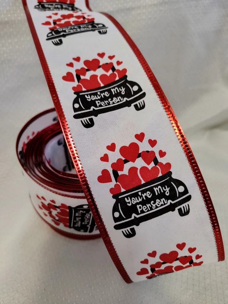 One yard*2.5" wide*Wired Ribbon "You're My Person" Love*Hearts*Valentine*Wedding Party*Pretty Red Metallic wired edges. New! 100% polyester fabric ribbon.