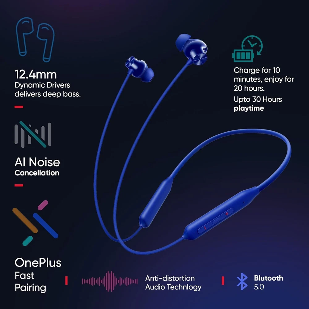 OnePlus Bullets Wireless Z2 { Beam Blue } - Bluetooth Wireless in Ear Earphones with Mic - Bombastic Bass – 12.4 mm Drivers - 10 Mins Charge – 20 Hrs. Music || 30 Hrs. Battery Life - IP55 Dust and Water Resistant About this item: Comes With Mic : Yes || Bluetooth Version : 5.0 || Battery life : 30 Hours || Ai Noise-Cancellation Codec : Supports AAC and SBC Bluetooth Connection range Up to 10 meters A quick 10-minute charge delivers up to 20 hours of immersive audio playback. The flagship-level battery life delivers up to 30 hours of non-stop music on a single charge. A large 12.4 mm bass driver delivers uncompromisingly deep bass for powerful beats. Experience incredibly rich audio detail at every frequency with the titanium coating dome Anti-distortion audio technology ensures your audio playtime stays silky-smooth. Thanks to the larger sound cavity and industry-leading algorithms, notes remain distortion-free Water and sweat-resistant, the IP55-rated internals and design ensure your OnePlus Bullets Wireless Z2 stay all-weather ready. Battery Average Life : 30.0 Hours; Model: E305a; Frequency Range: 20hz – 20khz; Control Type: Call Control In the Box : 1 Neckband, Type-C Cable, Additional Pair of Ear tips, User Mannual & Guide. Rapid Recharge for Extended Playtime – You can experience uninterrupted music with the OnePlus Bullets Wireless Z2 Bluetooth Earphones’ fast-charging feature. A quick 10-minute charge provides up to 20 hours of audio playback, which allows you to enjoy your favorite tunes, podcasts, or audiobooks all day. So, you can enjoy your music on the go without worrying about running out of power before your long commute. Long-Lasting Battery Life – With flagship-level battery life, this OnePlus Bullets Z2 earphones offer up to 30 hours of non-stop music on a single charge. Stay connected with friends and family for extended periods, with up to 16 hours of talk time. Plus, with an impressive standby time of 80 hours, these earphones are always ready whenever you need them. Powerful Bass and Immersive Clarity – Built with a large 12.4mm bass driver, this OnePlus Bullets Z2 Bluetooth earphones deliver deep bass, while the titanium-coated dome ensures rich audio detail at every frequency. With these earphones, you can truly immerse yourself in your music, hearing and feeling every beat with clarity. Distortion-Free Audio – Featuring anti-distortion audio technology, a large sound cavity, and advanced algorithms, these OnePlus Bullets Z2 earphones ensure that your music remains distortion-free. AI-Powered Noise Cancellation – The AI scene-model algorithm in these OnePlus earphones dynamically adjusts the microphone’s call noise reduction, isolating your voice from ambient surroundings. So, you can enjoy clear conversations even in noisy environments. Weather-Ready Durability – Boasting an IP55 rating, these wireless earphones are water- and sweat-resistant. Whether you’re caught in unexpected rain or pushing your limits at the gym, these earphones are designed to keep up with your active lifestyle. Enhanced Comfort – OnePlus Bullets Z2earphones are crafted from skin-friendly silicone material and feature an ergonomic curved design, ensuring optimal comfort for all-day wear. OnePlus Fast Pairing – OnePlus Bullets Z2 Fast Pairing ensures quick and effortless connections, allowing you to pair your devices instantly for a seamless and hassle-free experience. Technical Details : Brand OnePlus Model Name Bullets Z2 Model Number E305A Color Beam Blue Headphone Type In the Ear Inline Remote Yes Connectivity Bluetooth Headphone Design Behind the Neck Compatible Devices Laptop, Mobile, Tablet Product Details Deep Bass Yes Water Resistant Yes With Microphone Yes Connectivity Features Bluetooth Version 5 Battery Life 30 Hours Charging Time 10 min Dimensions Depth Warranty Warranty 1 Year Manufacturer's Warranty ✦ 100% Genuine & Brand New Item... . ✦ Comes With All In-Box Accessories... . Please Feel-Free To Reach Us, If There's Any Query... . - To Raise Query, Please Use "Contact Seller" Tab ... . Worldwide FREE & FAST SHIPPING... . - All the items were shipped with 100% in-transit Insurance. - Shipping and Handling Charges Include Shipping, Handling, Packing Material, Boxes, Fuel Charges and Warehouse Processing Charges - OCTROI, Custom DUTIES AND ALL OTHER LOCAL TAXES / CHARGES / LEVIES ARE NOT INCLUDED. THE BUYER HAS TO PAY WHEN DEMANDED BY THE COURIER AT THE TIME OF DELIVERY. W e Believe In " 100 % Customer Satisfaction "... . - So, Buy With Confidence... . ✦✦✦ Happy Shopping ✦✦✦ CE LL BA Y- W O R L D - At your service, Since 2003 ... .