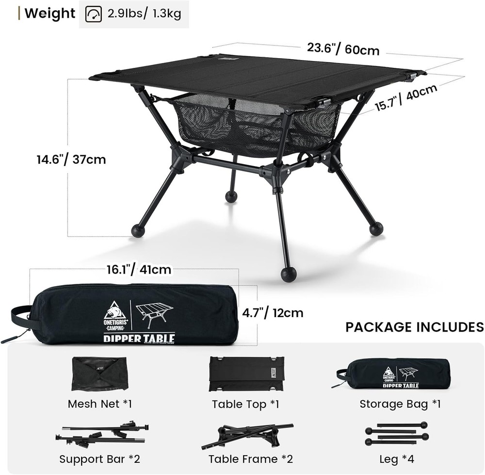 โ ๐๐ฉ๐ช๐ง๐๐ฎ ๐พ๐ค๐ฃ๐จ๐ฉ๐ง๐ช๐๐ฉ๐๐ค๐ฃ: This foldable table is made of 7075 aluminum alloy table legs with special anti-slip table legs, and a roll-up 600D polyester fabric table top that's wrinkle-resistant, long-lasting, water-resistant, can be removed and easily washed (hand wash) โ ๐๐๐๐๐๐ฉ ๐ผ๐๐๐ช๐จ๐ฉ๐๐๐ก๐: Unique creative patent designed table frame with excellent stability, and the table legs are removable, so you can adjust the height depending on use โ ๐ผ๐๐๐๐ฉ๐๐ค๐ฃ๐๐ก ๐๐ฉ๐ค๐ง๐๐๐: A portable camp table with detachable high strength mesh basket for storage, extra large capacity (6L) with 22lbs (10kg) load capacity to put smaller items such as cooking utensils, water bottles, flashlights or groceries โ ๐๐๐๐ ๐ฟ๐ช๐ง๐๐๐๐ก๐๐ฉ๐ฎ: Solid yet lightweight table with outstanding bearing and load capacities up to 66lbs (30kg), anti-scratch surface with heat resistant, you can put your hot food on it โ ๐๐๐๐๐ฉ๐ฌ๐๐๐๐๐ฉ & ๐พ๐ค๐ข๐ฅ๐๐๐ฉ: The dimension of the table is 23.6" by 15.7" by 15.3" (60cm *40cm *39cm), folds up small, packed size 16" *5.9" *3.9" (41cm *15cm *10cm), weighs only 2.87lbs (1.3kg), comes with a zippered storage bag provides great convenience for you to carry around, ideal for camping, hiking, fishing, festival, picnic, etc