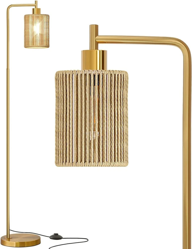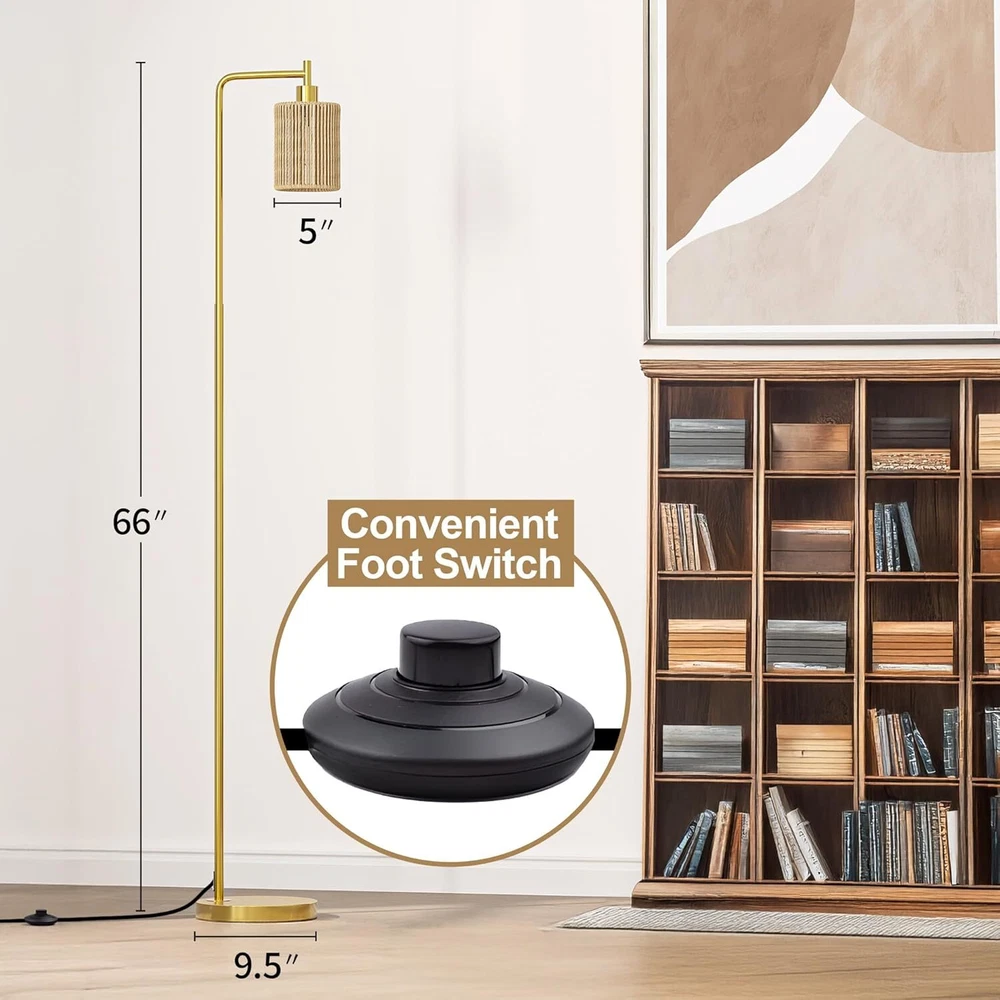 Oneach 66" Gold Floor Lamp for Living Room, Boho with LED Product Details Finish Type: Polished Base Material: Metal Bulb Base: E26 Product Dimensions: 12"D x 9.5"W x 66"H Lamp Type: Floor Lamp Shade Color: Gold Shade Material: Rattan Switch Type: Foot Style: Modern Brand: Oneach Color: Gold Special Feature: Corded Light Source Type: LED Material: Metal Room Type: Office, Living Room, Bedroom Power Source: Corded Electric Controller Type: Foot Control Number of Light Sources: 1 Included Components: Bulb included Is Waterproof: false Bulb Shape Size: A19 Mounting Type: Floor Mount Wattage: 6 watts Number of Items: 1 Lighting Method: LED Control Method: Remote Indoor/Outdoor Usage: Indoor Efficiency: Energy Efficient Voltage: 110 Volts Base Diameter: 9.5 Inches Is Cordless?: No Manufacturer: Oneach Home Shade Height: 61 Inches Item Weight: 9.24 pounds Country of Origin: China Item model number: MZ-F1222 Finish types: Polished Special Features: Corded Batteries Included?: No Batteries Required?: No Product Dimensions : 12 x 9.5 x 66 inches; 9.26 Pounds Item model number : MZ-F1222 Manufacturer : Oneach Home Country of Origin : China Finish Type: Polished Base Material: Metal Bulb Base: E26 Product Dimensions: 12"D x 9.5"W x 66"H Lamp Type: Floor Lamp Simple Design Gold Floor Lamp: This 66inch gold floor lamp features a sleek and minimalist design, making it a perfect complement to various decor styles in your living room, bedroom, study, restaurant, or office. We have designed 3 different lamp shades for selection, you can choose from glass shade, rattan shade, or cage shade with paper rope wrapped around the metal, just depending on your preference or your individual needs Come with a 6W LED Bulb: This tall lamp comes with a 6W bulb, so that you can use the floor lamp right after you receive without purchase an extra bulb. Compatible with E26 bulb socket, allowing you to customize your lighting with a variety of bulbs to suit your preference and needs. Just DIY it Sturdy Base and Quality Material:This gold floor lamp is made of high-quality metal material and built with a robust base. Ensuring it remains upright and secure without the risk of tipping or falling over, making it safe for households with children or pets Convenient Foot Switch: Designed for easy accessibility, the foot switch on the cord allows you to effortlessly turn the gold standing lamp on and off with just a tap of your foot, adding convenience to your lighting experience. The extended 6ft cord allows you to place the floor lamp anywhere you want, such as near seats, sofas, side tables, beds Easy Assembly: This living room floor lamp can be easily assembled without any tools. Just simply follow the user manual step by step to combine all the accessories and you'll be able to assemble the tall lamp in less than a few minutes