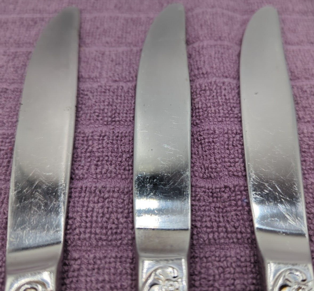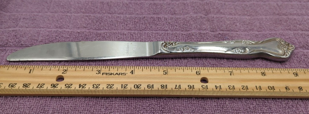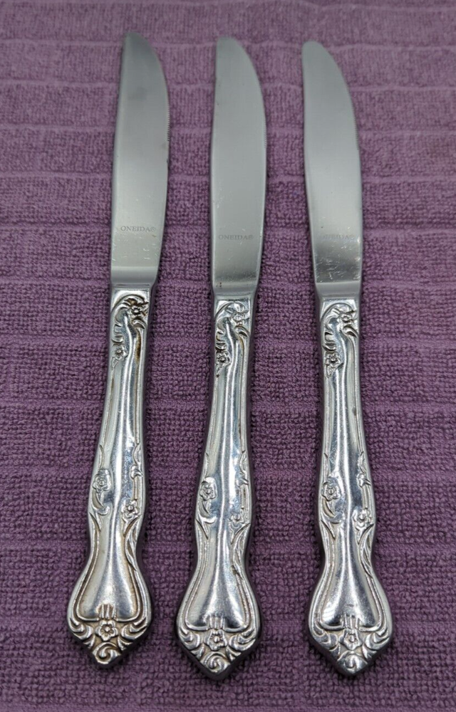 Oneida Azalea Set of 3 Dinner Knives Stainless Flatware Replacements. Normal pre-owned condition. Please see the photos for a more complete description of the condition. All of my items are carefully packed for shipping, no matter their value - $5 items are wrapped with the same care as a $200 item. My goal is to have your purchase arrive safely. Large, heavy and fragile items are harder to use combined shipping with but just ask if you would like to purchase more than one item and I am more than happy to do so if feasible. Measurements are approximate or as close as I can get. Also, the color you see many not be the exact color depending on your computer or phone settings. Unpaid items will result in the buyer being blocked from further purchases. Please remit payment right away so we can get your item shipped out quickly.