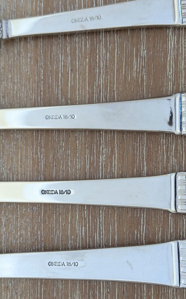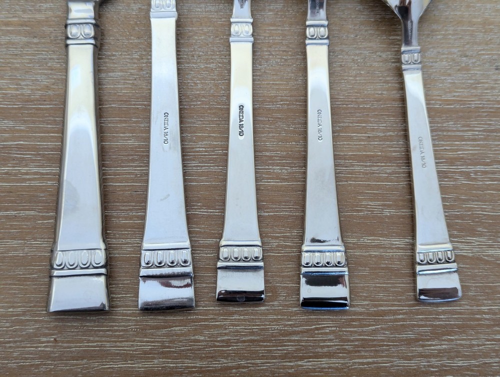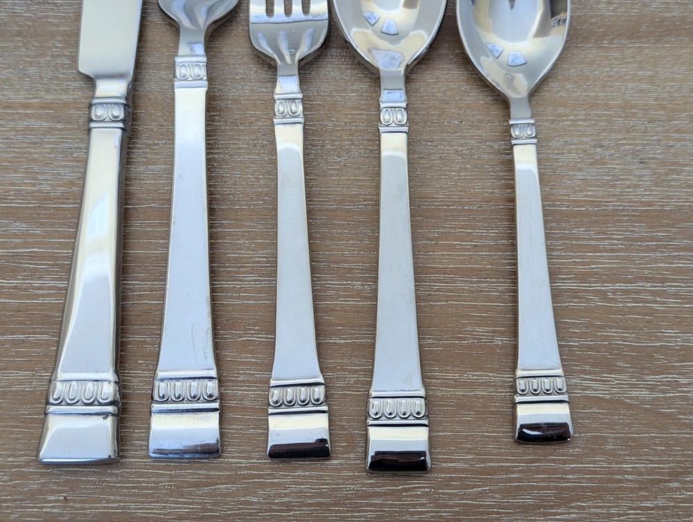 Oneida CADENCE 18/10 Stainless Indonesia 35 Piece SET Teaspoon Salad Dinner Fork Includes: 6 x dinner knife 6 x dinner fork 6 x salad fork 6 x soup spoon 6 x teaspoon 1 x serving spoon 1 x slotted serving spoon 1 x serving fork 1 x sugar spoon 1 x butter knife **Gently used set in Excellent pre-owned condition! Just Lovely!! **SEE PHOTOS! From a pet-free & smoke-free home. Shipped quickly and carefully from Kansas! Thank you for looking 😊 -------------------------