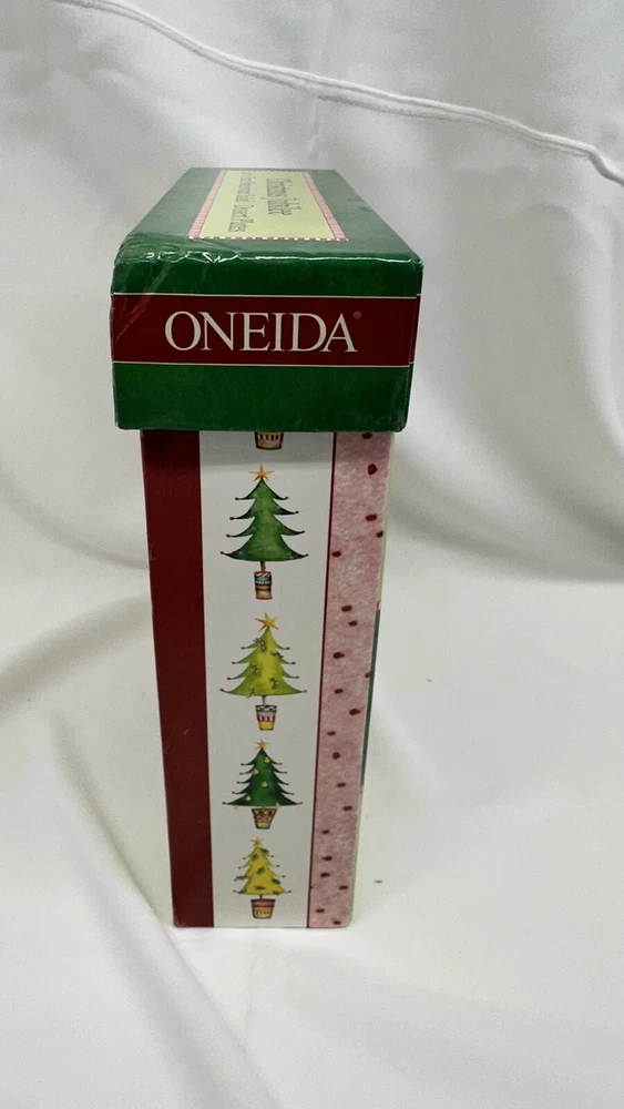 Add some festive flair to your dinner table with this set of four Oneida Christmas Jubilee Stoneware Salad/Dessert Plates. Each plate has a diameter of 8 inches and features a charming Christmas tree pattern in vibrant multicolor. Perfect for your holiday celebration, these plates are made of durable stoneware and can withstand daily use. These contemporary original plates are not only functional but also decorative. They are suitable for any Christmas occasion, and their art pottery production style adds to their uniqueness. Get ready to impress your guests with these ONEIDA plates without worrying about their quality, as they are brand new.
