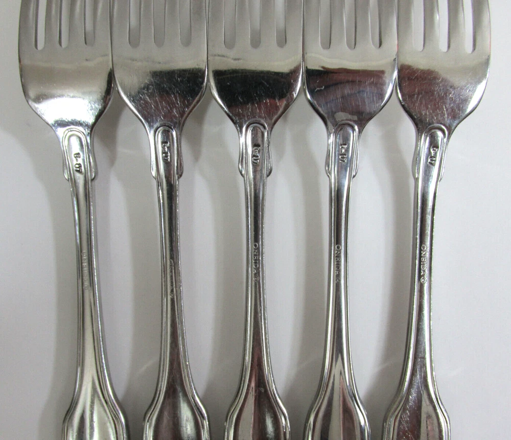 Handle Material: Stainless Steel Color: Silver Model: Classic Shell Material: Stainless Steel Seller Notes: “Good condition, showing some scuffs and scratches from normal use. Overall signs of use seen.” Style: Traditional Brand: ONEIDA Type: Fork Lot Set Includes: 5 Forks Item Length: 7.6 in Country/Region of Manufacture: United States