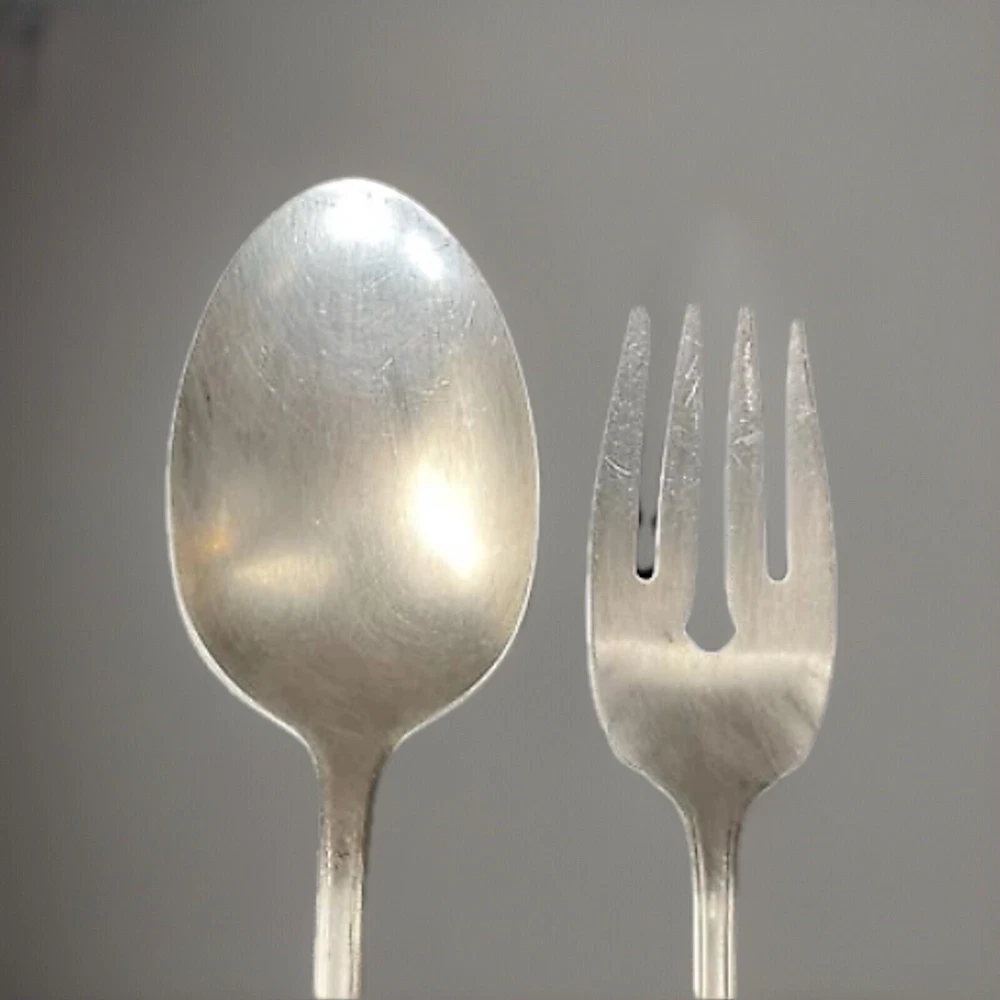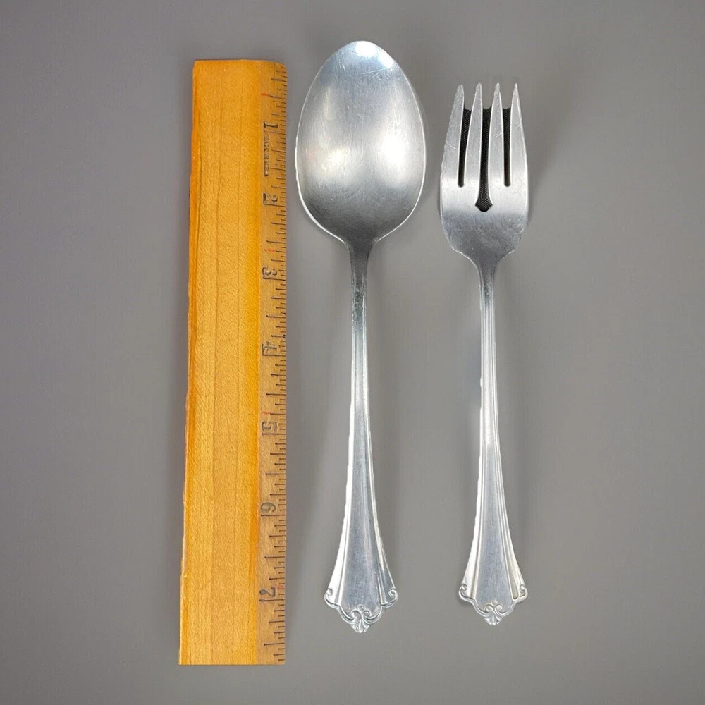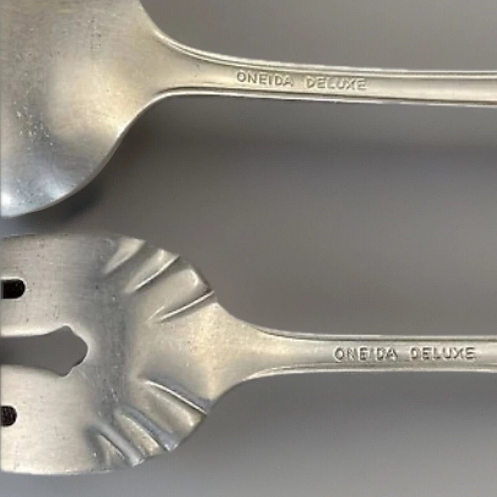 Replacement tablespoon and salad fork in the “Anticipation” pattern for Oneida Deluxe flatware line. Please see photos for conditional details and measurements. Please note the fork’s chipped tine and scratches. These are in preowned condition with visible wear.