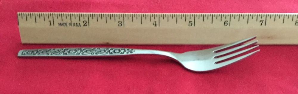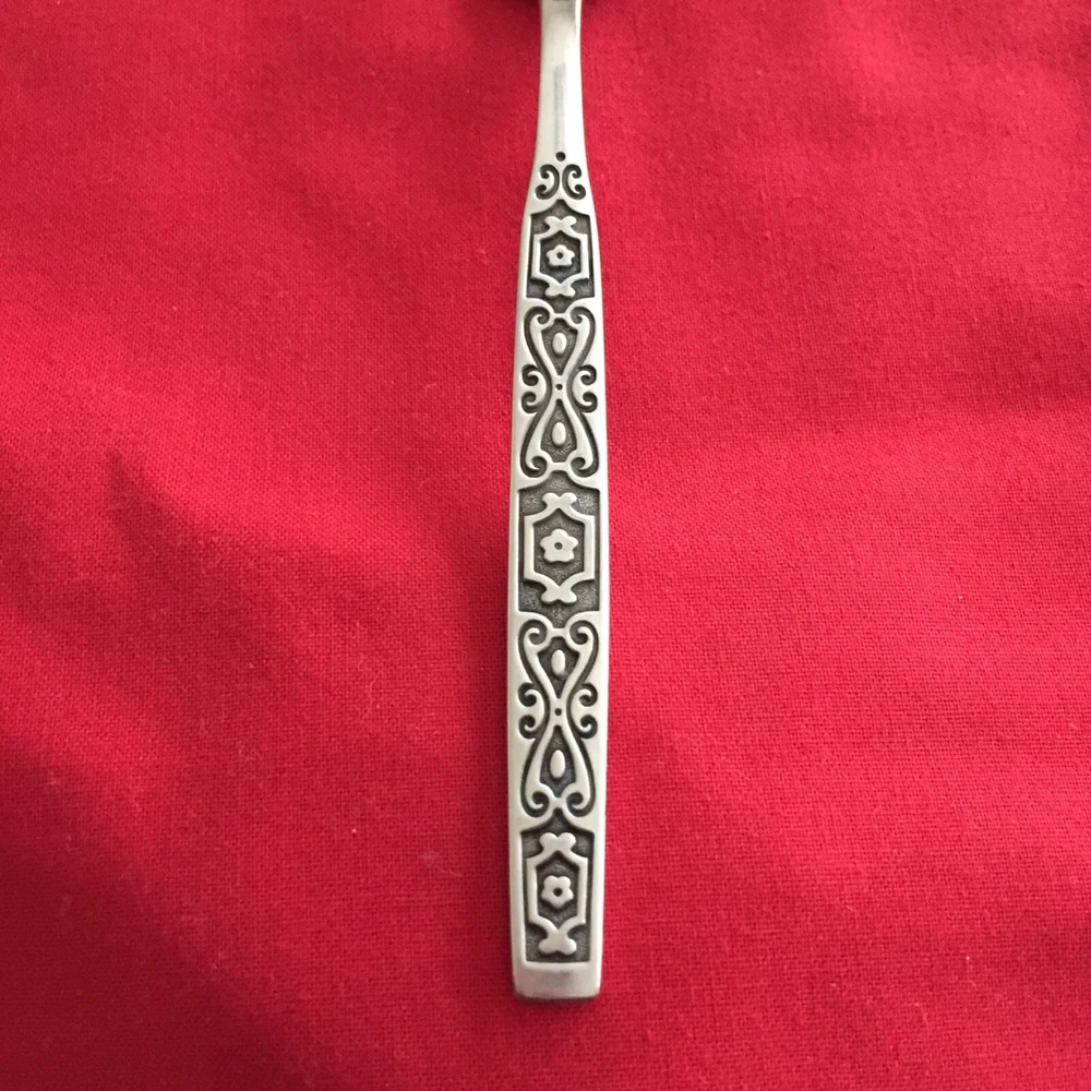 Manufacturer: Oneida Deluxe Pattern: Spanish Mood Type: Stainless Steel Piece: Salad Fork Length: 6 1/4" Add'l wear on tines, Structurally sound.