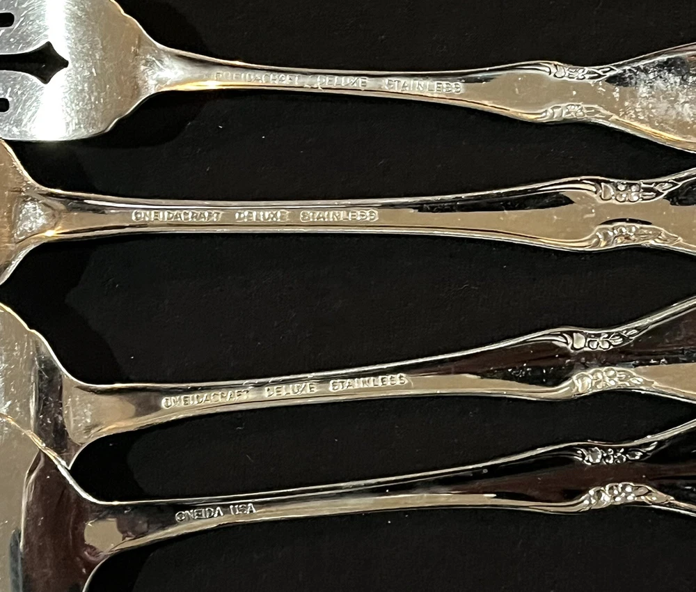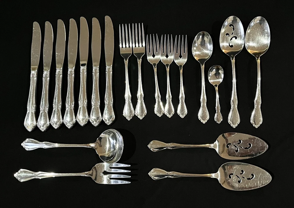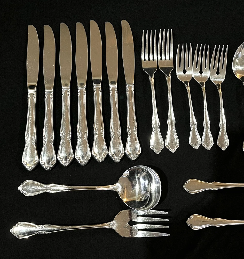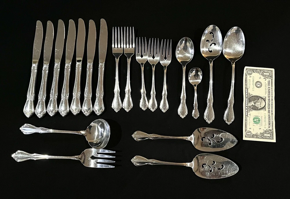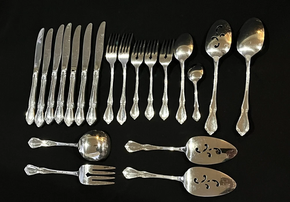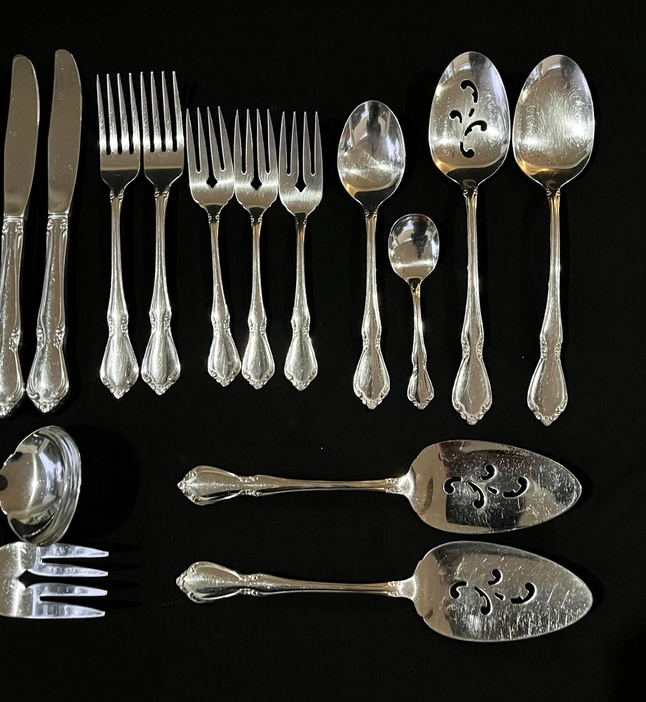 This listing is for the lot of 20 pieces in "Chateau " design by Oneidacraft (Oneida). These are all vintage pieces made in the U.S.A. Flatware have marking of "ONEIDACRAFT DELUXE STAINLESS" and "ONEIDA USA", knives have no marking . This lot includes the following pieces: • Dinner Knife - 7 • Dinner Fork - 2 • Salad Fork - 3 • Table Spoon - 1 • Serving Spoon - 1 • Pierced Serving Spoon - 1 • Serving Fork - 1 • Sugar/Jam Spoon - 1 • Soup Ladle - 1 • Pierced Pie Server - 2 TOTAL: 20 Pieces These are in silver-tone stainless steel flatware. Any color is just lighting reflection. They are in excellent previously owned and used condition as shown. A $1 bill is placed for size reference and not included. I do not wish to take return, so please review photos and ask all the necessary questions before purchasing this item. * * * Non-smoking environment! * * *