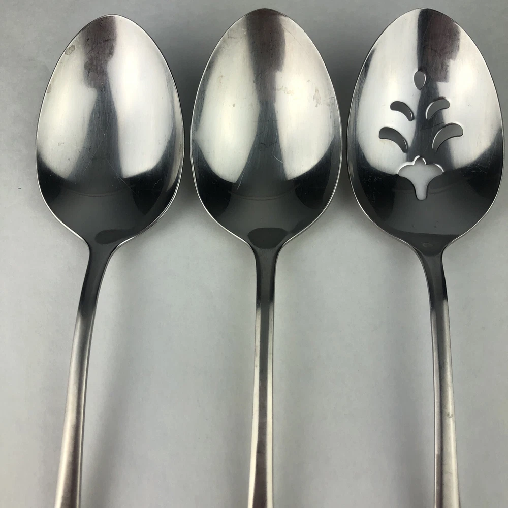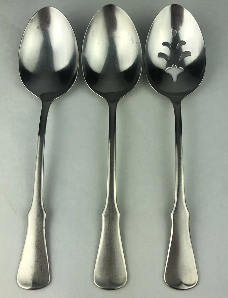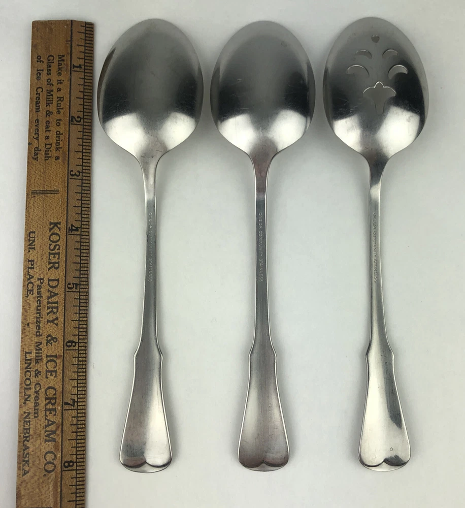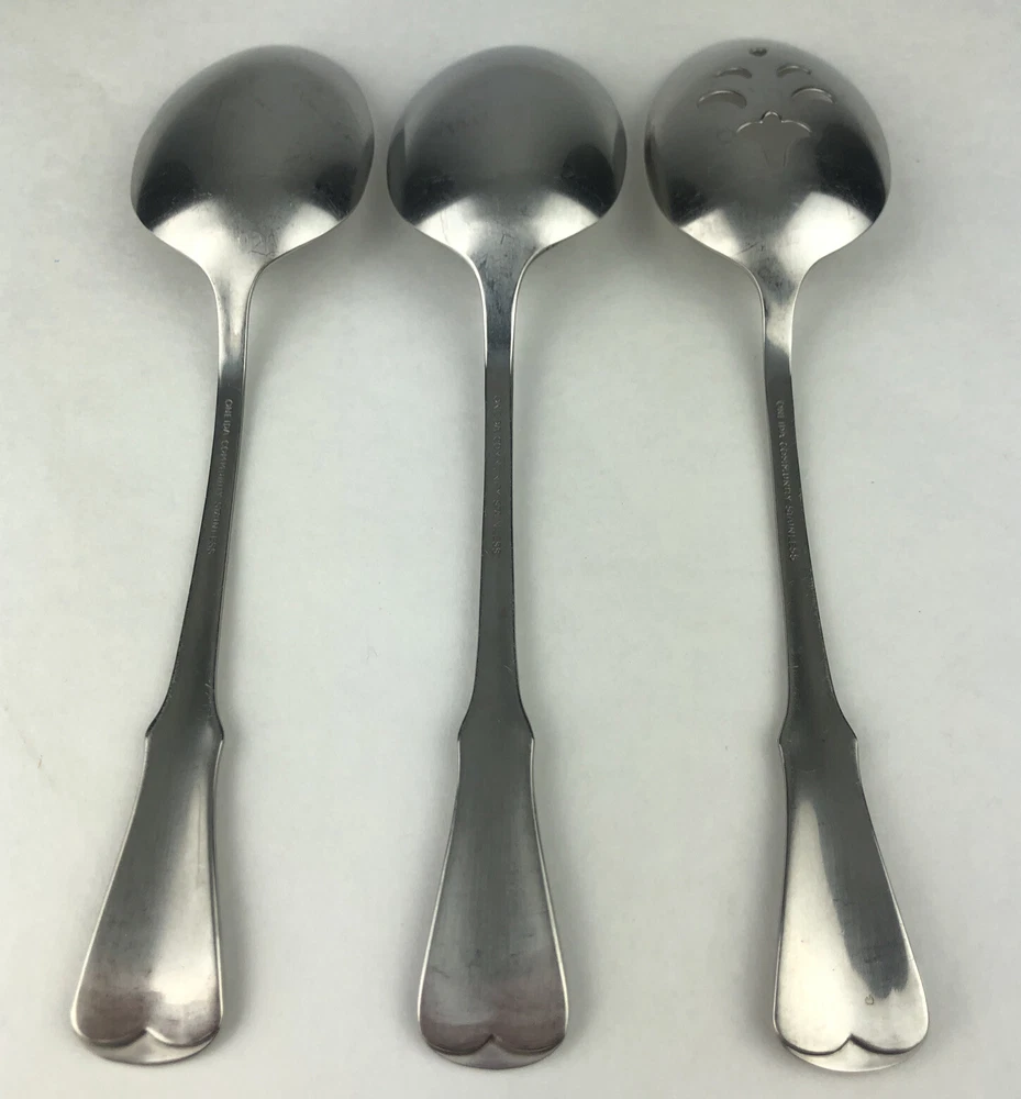 Vintage Oneida PATRICK HENRY Community Stainless 3 Piece lot includes: 2 solid serving spoons ~ 8.25" 1 pierced serving spoon ~ 8.25" Shows signs of light use and may need additional cleaning. Little spotting in places but no dishwasher or disposal damage. Overall very nice condition. Please see pictures for details as this is part of my description.