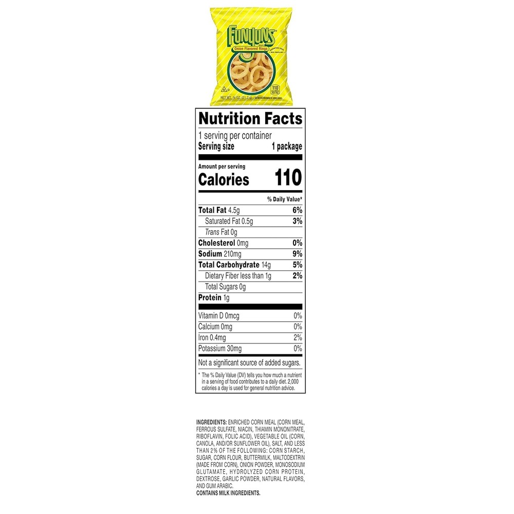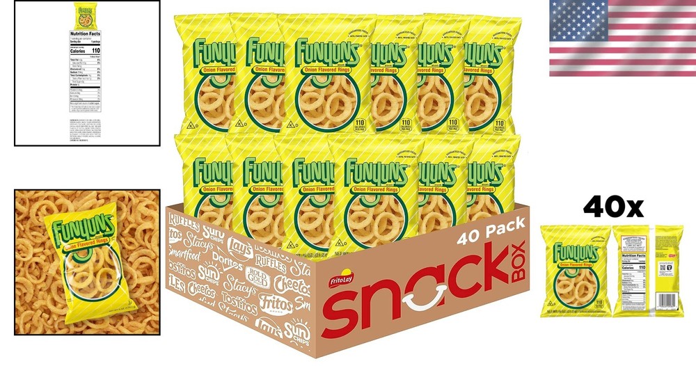Onion Rings Snack - 40 Bags, 0.75 oz Pack of Forty: Enjoy ample snacking options with 40 convenient 0.75 ounce bags. Zesty Flavor: Delight in the bold and savory taste of onion with every crunchy bite. Gluten Free & Kosher: Perfect for those with dietary restrictions without sacrificing flavor. Perfect for Any Occasion: These much-loved treats are ideal for lunchboxes, after-school snacking, or as a refreshing addition to your next gathering. Convenient Packaging: Easy to carry, store, and pack, making these onion rings the go-to snack for on-the-go lifestyles. Freshness Guaranteed: Best enjoyed before the expiration date displayed on each package (60-90 days shelf life). Why Choose Our Onion Rings Snack? Indulge in the irresistible crunch and zesty flavor of our Onion Rings Snack. This perfect balance of fun and flavor makes them a delightful treat that everyone will love, from children to adults. Each of the 40 bags is a pocket-sized delight, ready to enhance your picnics, parties, and daily snacking. Whether you're looking for a tasty addition to your lunchbox, a satisfying after-school snack, or a delightful party treat, these crispy onion-flavored rings are the perfect choice. Enjoy them straight from the bag or incorporate them into your favorite recipes for a unique twist! Experience snacking like never before – grab your pack of Onion Rings Snacks today! Expiration Date: 60-90 days Type: Snacks Calories per 100 g/mL: Not specified Style: Onion Flavored Rings Unit Quantity: 30.0 ounce Flavor: Onion Food Specifications: Gluten Free,Kosher Allergens: Gluten Product: Chips Packaging: Single Bag Calories per Serving: Not specified Number of Servings: 40 Serving Size: 0.75 Ounce Number in Pack: 40 Course: Snacks & Appetisers Food Aisle: Pantry Item Weight: 30 ounces Unit Type: oz