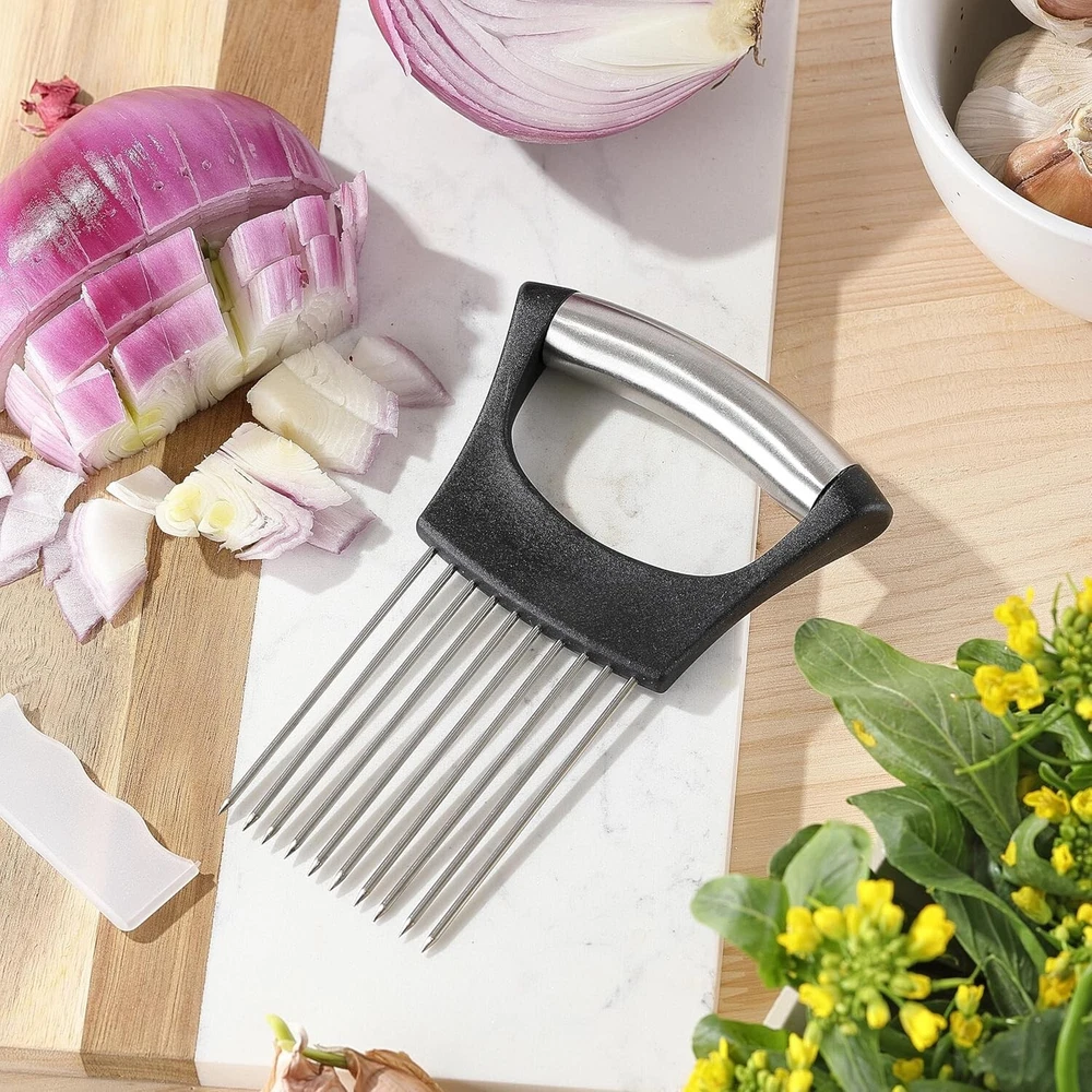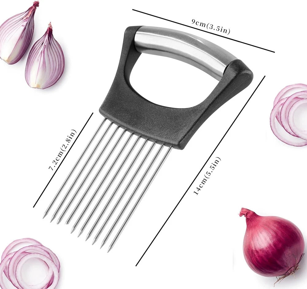 FEATURES & DETAILS Enhanced Safety Design: The onion chopper is equipped with a secure grip mechanism that firmly holds vegetables in place, reducing the risk of accidental slips and cuts. The innovative design of this onion slicer creates a protective barrier between the user's hand and the sharp blade, ensuring a safe and worry-free slicing experience. Whether you're a seasoned chef or a cooking enthusiast, the safety-focused design makes this onion cutter an excellent choice for users of all skill levels. Durable Stainless Steel Construction: Crafted from premium stainless steel, the onion holder is built to withstand the rigors of daily kitchen use, providing long-lasting durability. The stainless steel blade of this onion holder for slicing is rust-resistant, maintaining its pristine appearance even with frequent use. The non-porous nature of stainless steel makes cleaning a breeze, ensuring convenience in your kitchen. Versatile Vegetable Slicing: Beyond onions, this tomato slicer is versatile enough to handle various vegetables, such as tomatoes, potatoes, and more, offering a one-stop solution for your slicing needs.The design promotes uniform slicing, enhancing the presentation of your dishes and ensuring even cooking for a professional touch.Streamline your food preparation by using a thin onion slicer for different vegetables, saving time and effort in the kitchen. User-Friendly and Easy to Use: The user-friendly design of this onion slicer and chopper requires minimal effort, allowing for a smooth and efficient slicing process. The ergonomic handle of this vegetable slicer provides a comfortable grip, reducing hand fatigue and making it easy to handle for extended periods. Elevate Your Cooking Experience: Achieve professional-looking results in your culinary creations with the precision and control offered by the onion slicer. Make cooking an enjoyable experience by using the onion cutter that enhance your skills and contribute to the joy of creating delicious meals. CONTACT US We are delighted to have you as our customer. Your satisfaction is our priority. If you need any assistance or information regarding our products, please do not hesitate to reach out to us through messages. We guarantee a response within 24 hours and a resolution to your problem as soon as possible.