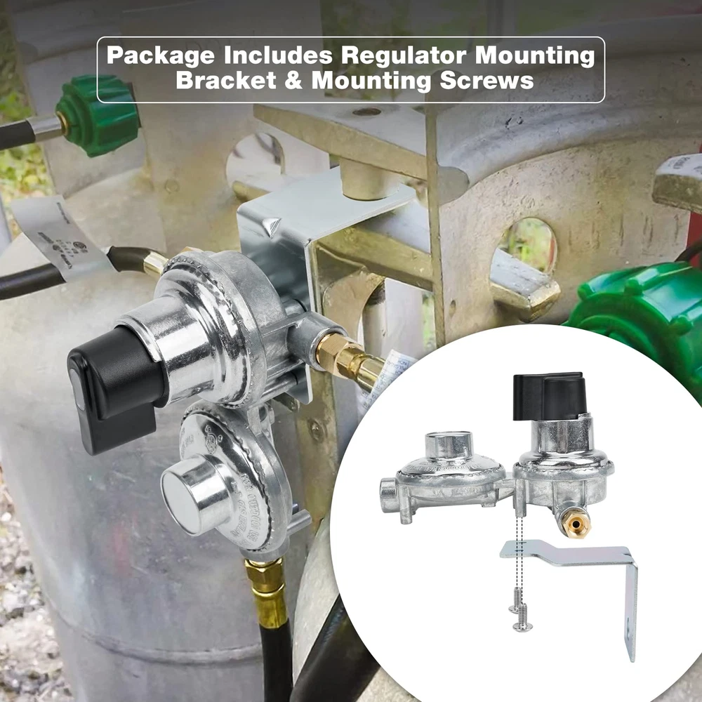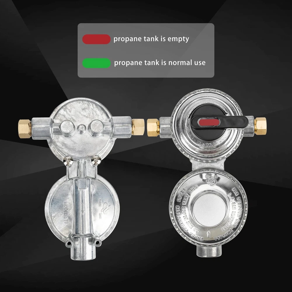 The indicator will read either green or red under normal conditions. The green just indicates that the primary tank still has propane. When the main tank is empty, the propane automatic switching regulator knob will turn red, reminding you to turn the knob to point to the backup tank, making it the main tank, and causing the indicator to switch back to green. The dual-stage design can maintain constant air pressure under changing needs and conditions. Allows empty tanks to be removed for refilling without interrupting the propane supply. In colder temperatures, you may see the indicator gauge read some red and some green. This is because the cold outdoor temps cause the pressure inside the cylinder to decrease. 【Uninterrupted Propane Supply】-Allow you to connect 2 propane tanks at the same time. When the main tank is empty, the propane automatic switching regulator knob will turn red to let you know when a tank has been depleted and needs to be refilled. Reminding you to turn the knob to point to the backup tank, making it the main tank, and causing the indicator to switch back to green. 【Regulator Mounting Bracket Design】-The LP gas regulator is already drilled with mounting holes (M4 thread) , and the propane regulator comes with L-Mount Regulator Mounting Bracket and Screws for added convenience. 【High quality Regulator】- LP gas regulators and joints are made of premium die-cast aluminum and solid brass, with good anti corrosion and heat-resistance performance to ensure safety and no leaks. 【Regulator Specifications】-The propane auto-changeover regulator has a 1/4" SAE inverted flare inlet and a 3/8" female NPT outlet. Rated flow: 190, 000 BTU/hr 【Automatic Switch】-The 2-stage RV propane regulator is suitable for RV, trailer, truck, backyard dual propane regulator tanks with a dual propane tank connection system and enables a smooth changeover from empty to full tanks.