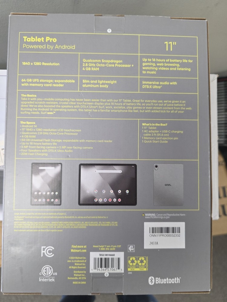 Onn. 100146660 11 Inch Tablet Pro, 64GB (2024 Model) - Gray . Shipped with USPS Priority Mail.
