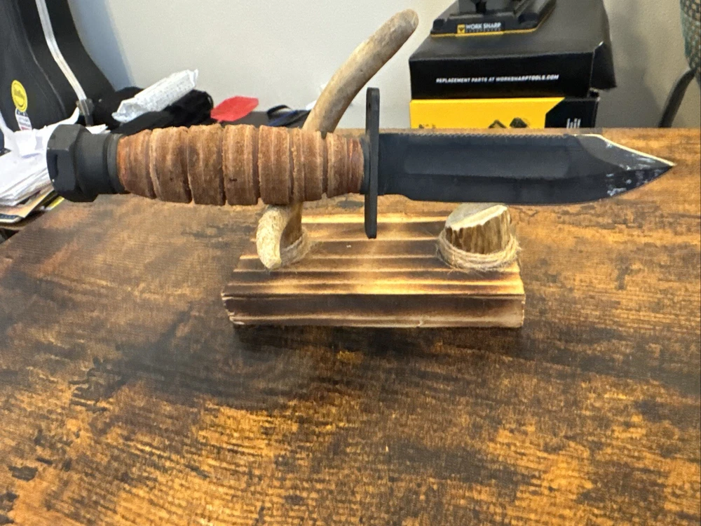 This Ontario Knife Company fixed blade knife is a must-have for any hunting, combat, or survival situation. Its durable construction and sharp blade make it a reliable tool for any task. The knife's sheath is designed for easy carrying and storage, ensuring it's always within reach when you need it. Includes sharpening stone Whether you're an avid hunter, a combatant, or a survivor, this knife is the perfect addition to your toolkit. Its modern design and factory-manufactured quality make it a top-of-the-line choice for any knife enthusiast. Ontario Knife Company has a reputation for excellence, and this knife is no exception. Get yours today and experience the ultimate in hunting, combat, and survival.