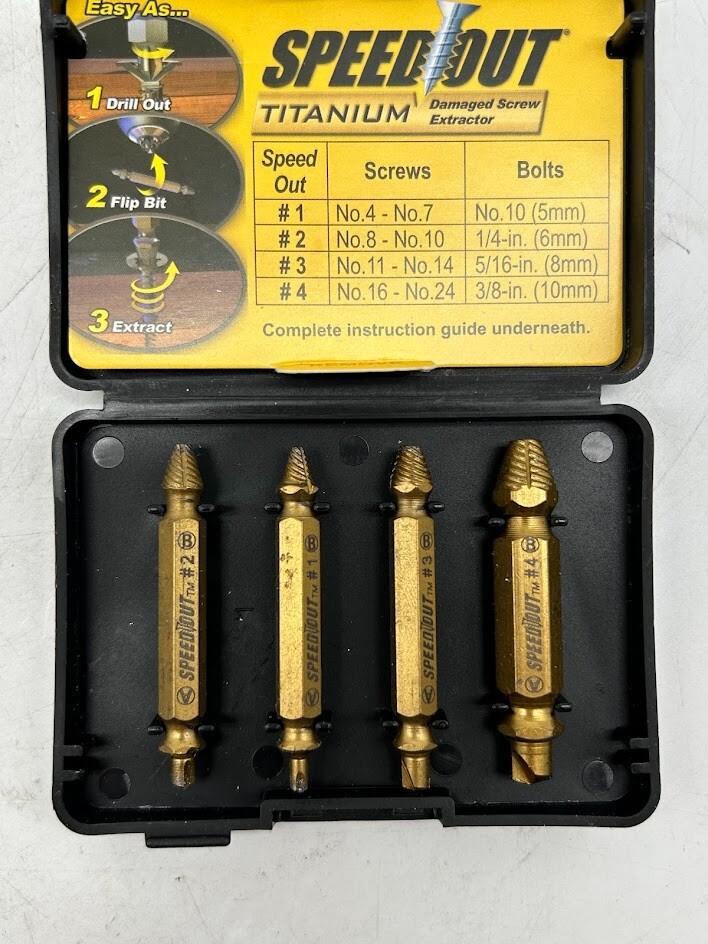Item shows some signs of use. The Ontel SpeedOut Titanium Damaged Screw and Bolt Remover is your go-to solution for extracting stripped or broken screws and bolts effortlessly. Whether you're dealing with stubborn deck screws or damaged bolts, this tool simplifies the task, allowing you to remove screws in 10 seconds or less. Engineered for versatility, the SpeedOut Titanium works with any drill, making it a reliable and essential addition to any toolbox. Highlights: Titanium Coating : Lasts 4x longer than traditional materials, ensuring durability and performance. Easy to Use : Works seamlessly with any drill, simplifying the extraction process. Versatile : Includes a 4-piece set that accommodates a wide range of screw and bolt sizes. Quick and Efficient : Removes damaged screws or bolts in 10 seconds or less. We take great care to inspect all items and ensure they are accurately described. Should you have any issues with your purchase, please let us know immediately. We are committed to resolving any concerns promptly and to your satisfaction. Our small business truly appreciates your patronage.