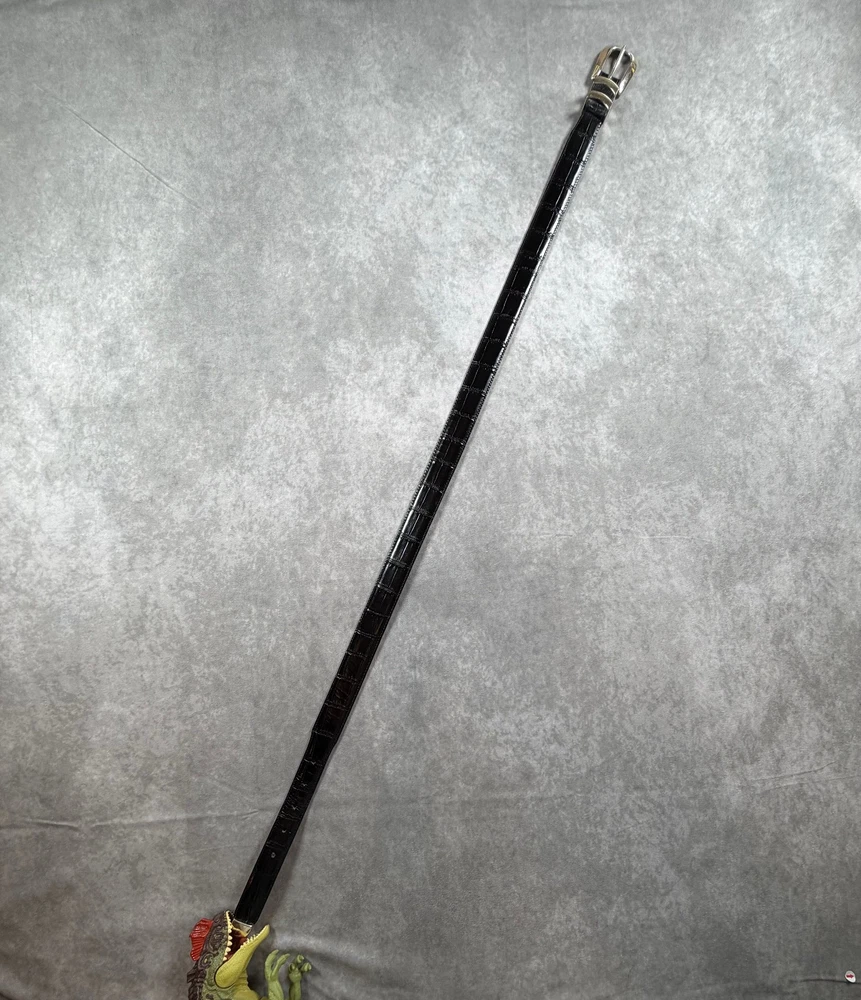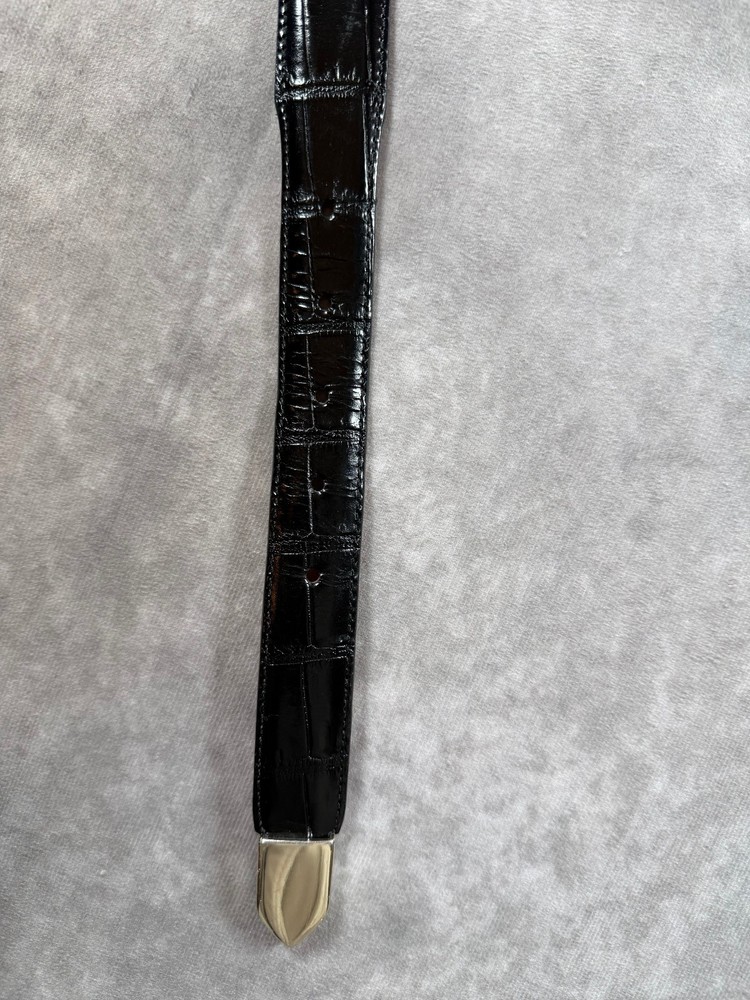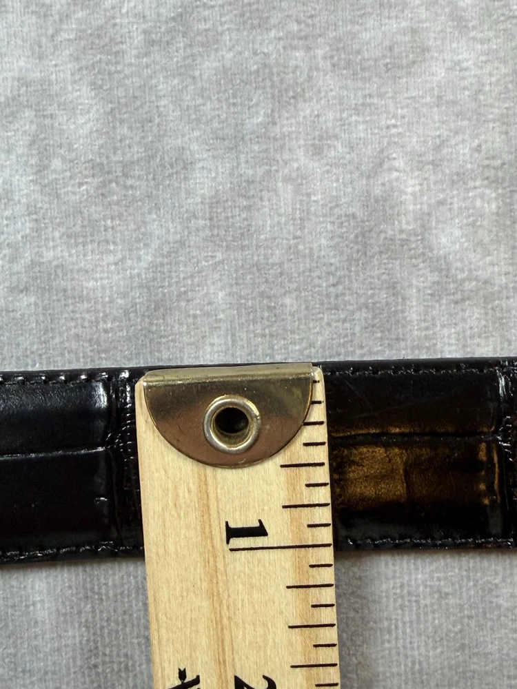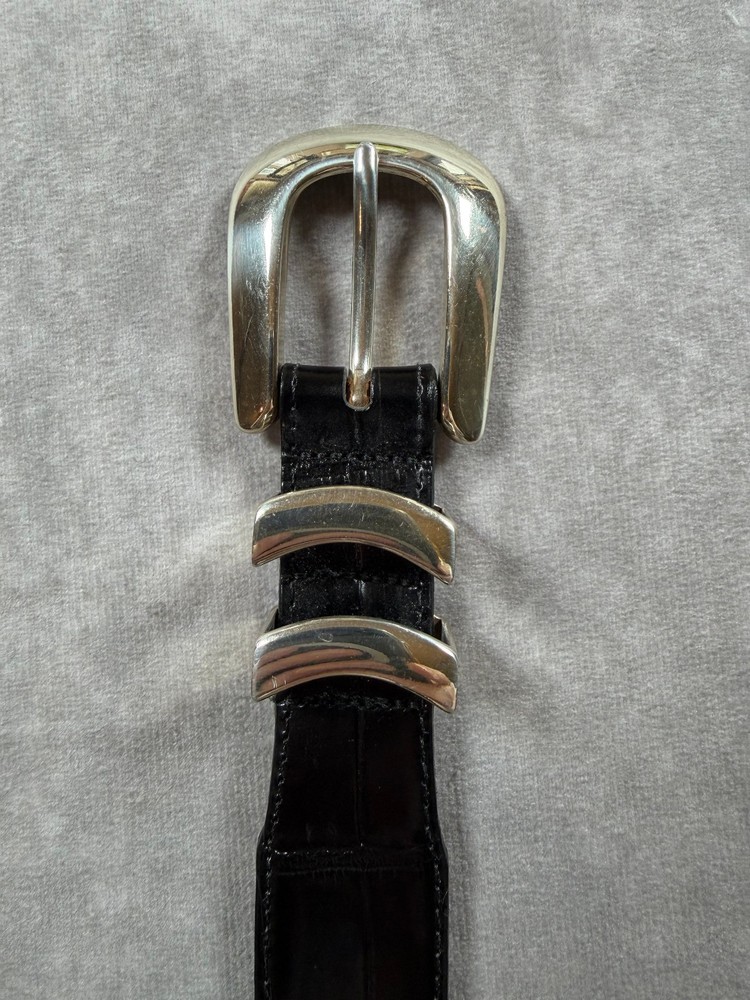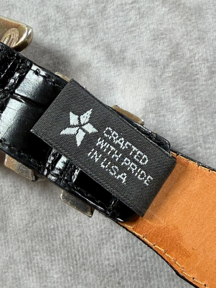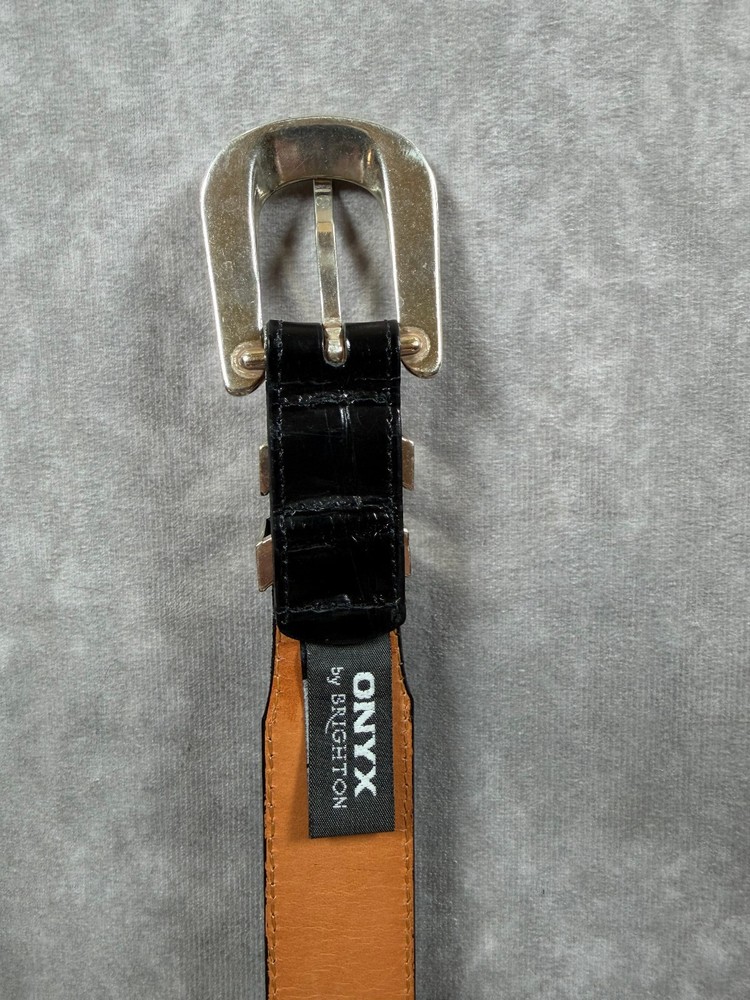 Onyx by Brighton men’s black croc-embossed leather belt with silver-tone buckle, double keepers, and metal tip. Pre-owned with light surface wear from normal use, including minor scuffs/scratches on hardware. Tagged Size: 36 Material: Leather (croc-embossed)