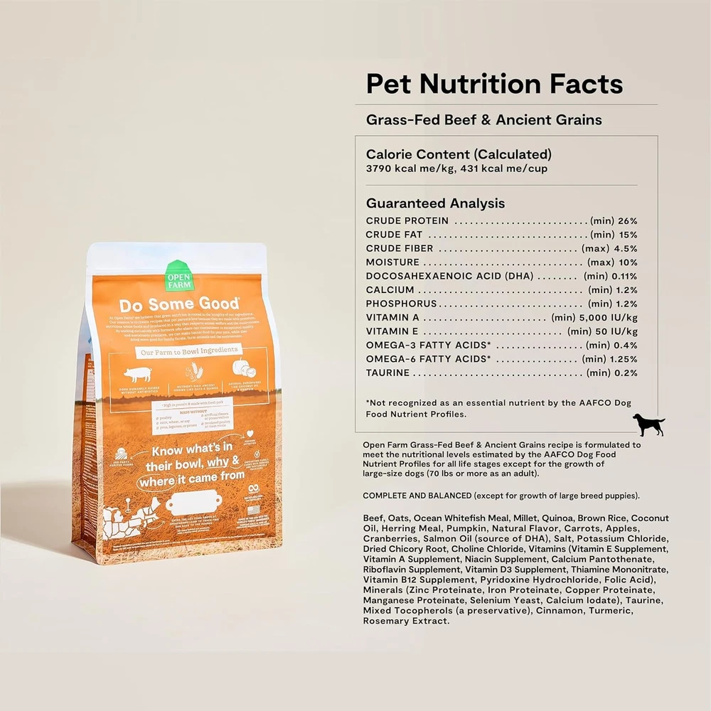 Open Farm, Ancient Grains Dry Dog Food, Protein-Rich & 11 Pound (Pack of 1) Description Features: Wholesome & Highly Digestible Ingredients - This high protein dog food blends ancient grains like oats and quinoa with real meat to make this recipe rich in protein, fiber, vitamins, and minerals. A Healthy, Grain-Inclusive, Complete & Balanced Diet - This natural dog food features humanely-raised turkey, non-GMO fruits and veggies, and superfoods like pumpkin, quinoa, and coconut oil. Recommended For Sensitive Stomachs - Unrefined ancient grains are often recommended for less active dogs or seniors, sensitive stomachs or those with legume and potato sensitivities. Made with Non-GMO Fruits & Veggies - Free of peas, potatoes, and legumes, this 100% traceable recipe has no artificial flavors, preservatives, or additives for optimal nutrition & peace of mind. Traceable and Transparent Ingredients - We use 3rd party certified ingredients, vetted and tested, and you can trace every single ingredient to its geographic origin Product Details: Item Weight: 11 pounds Manufacturer: Open Farm Country of Origin: USA Item Package Dimensions L x W x H: 18.9 x 11.42 x 3.54 inches Item Dimensions LxWxH: 3.1 x 9.5 x 17.8 inches Item Weight: 11 Pounds Brand Name: Open Farm Target Audience Keyword: dogs Directions: For Dogs Size: 11 Pound (Pack of 1) Age Range Description: All Life Stages Number of Items: 1 Breed Recommendation: All Breed Sizes Specific Uses for Product: Active Product Dimensions : 3.1 x 9.5 x 17.8 inches; 11 Pounds Manufacturer : Open Farm Country of Origin : USA Brand: Open Farm Flavor: Farmer's Table Pork Age Range (Description): All Life Stages Item Form: Pellet Specific Uses For Product: Active Handling We will ship all orders within 1 business day of payment. Delivery We Do Not Ship Outside of the Continental US. Return Policy All items qualify for returns within 30 days of receipt. Buyer is responsible for return shipping on any item that is not damaged. Feedback We take our reputation seriously, we buy and sell online, so we understand the value of trust. If you are unsatisfied with your order, please contact us and we will work with you to resolve it to your satisfaction.