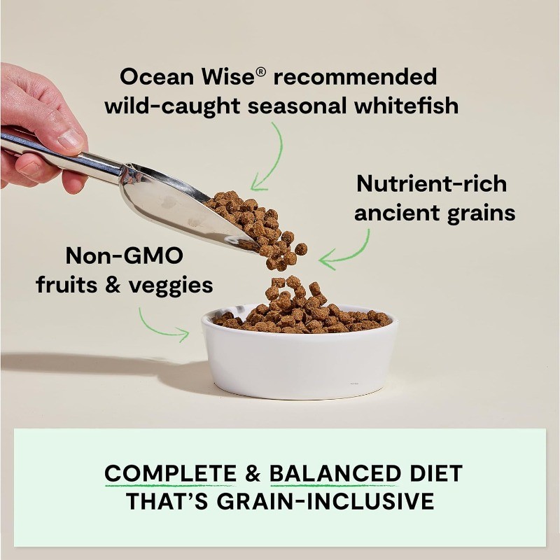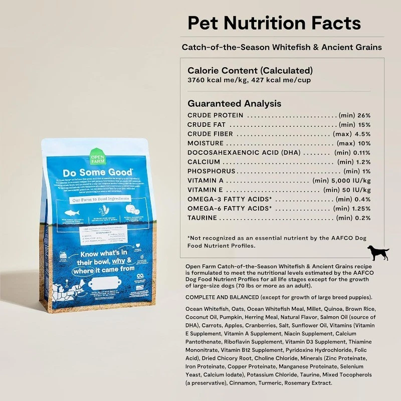 Open Farm, Ancient Grains Dry Dog Food, Protein-Rich & Nutrient Dense, 90% Animal Protein Mixed with Non-GMO Fruits, Veggies and Superfoods, Catch-of-The-Season Whitefish Recipe, 22lb Bag Flavor Name: Catch-of-the-Season Whitefish Ancient Grain Size: 22 Pound (Pack of 1) Brand: Open Farm Flavor: Catch-of-the-Season Whitefish Ancient Grain Age Range (Description): All Life Stages Item Form: Pellet Specific Uses For Product: Active About this item Wholesome & Highly Digestible Ingredients - This high protein dog food blends ancient grains like oats and quinoa with real meat to make this recipe rich in protein, fiber, vitamins, and minerals. A Healthy, Grain-Inclusive, Complete & Balanced Diet - This wild-caught seasonal whitefish dog food recipe features non-GMO fruits and veggies, and superfoods like pumpkin, quinoa, and coconut oil. Recommended For Sensitive Stomachs - Unrefined ancient grains are often recommended for less active dogs or seniors, sensitive stomachs or those with legume and potato sensitivities. Made with Non-GMO Fruits & Veggies - Free of peas, potatoes, and legumes, this 100% traceable recipe has no artificial flavors, preservatives, or additives for optimal nutrition & peace of mind. Traceable and Transparent Ingredients - We use 3rd party certified ingredients, vetted and tested, and you can trace every single ingredient to its geographic origin