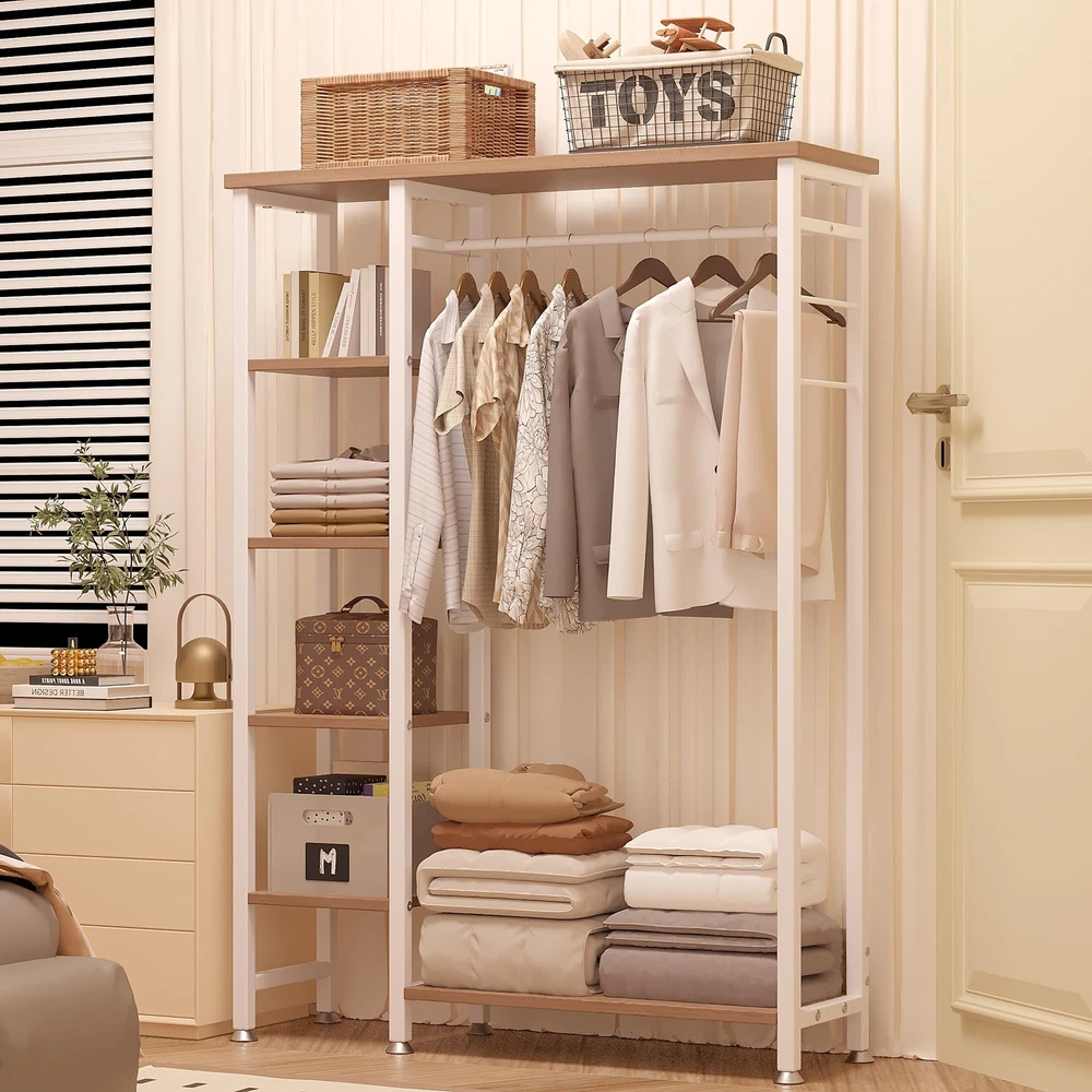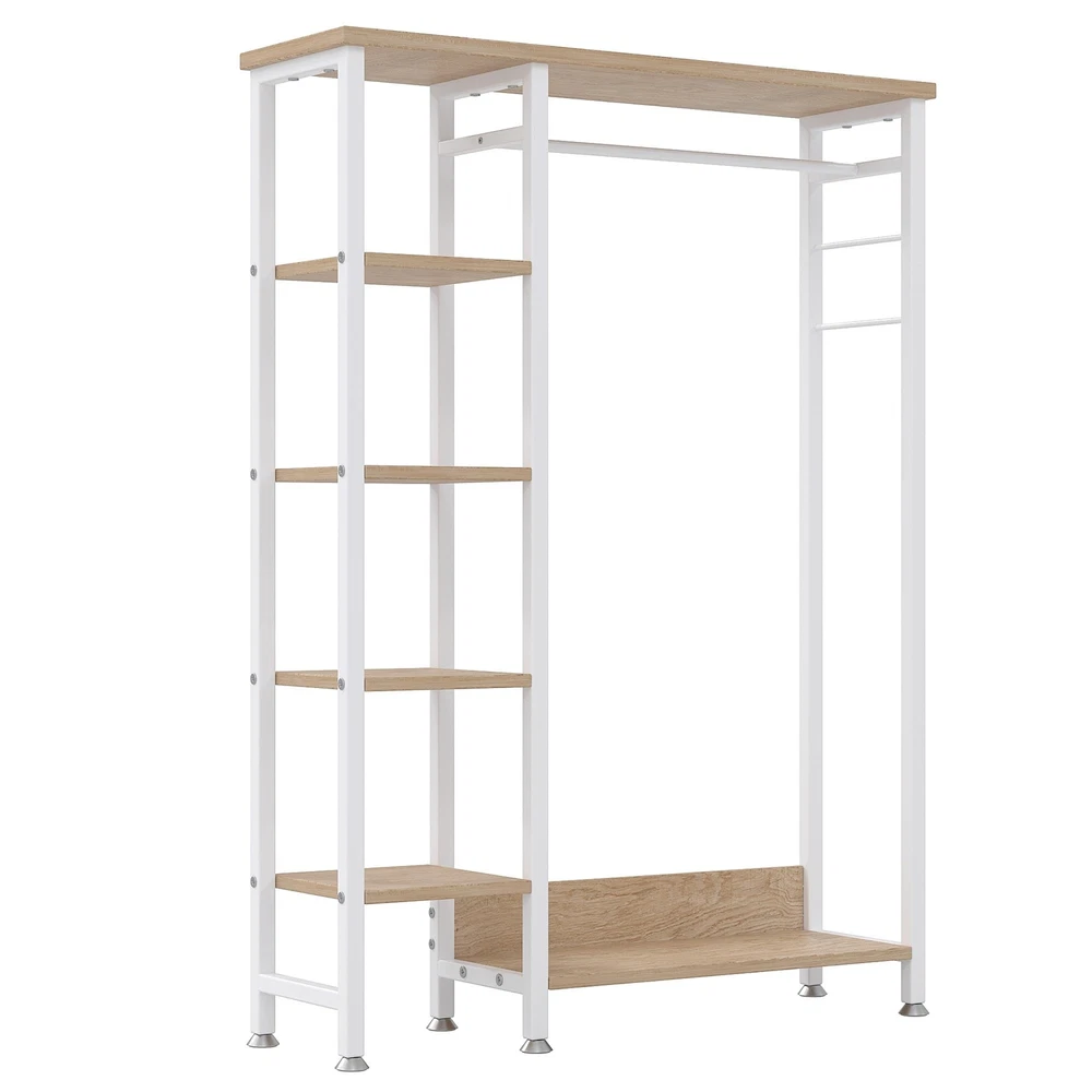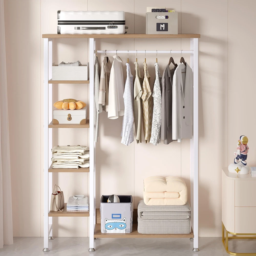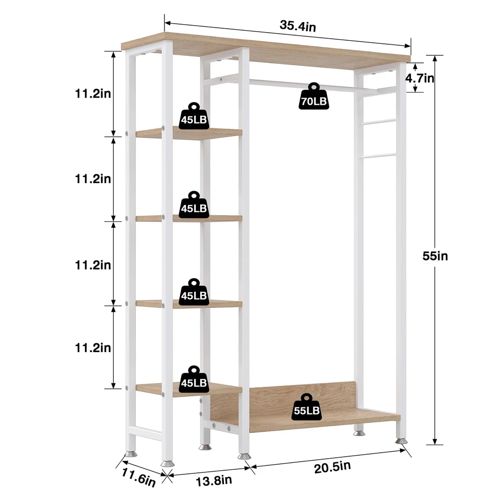 [Strong Weight Capacity] - Heavy duty metal frame paired with thick MDF board makes it super stable and sturdy, without wobble and collapse. Load capacity up to 350 lbs. Ideal for being a long-term wardrobe rack. [Ample Storage Space] - Features 2 large shelves and 4 small shelves, this freestanding closet provides enough space to place clothes, accessories, bedding, shoes, large luggage, etc. The garment rod can hold up to 70 lbs. It is great for hanging coats, pants, shirts or other heavy clothes without worrying about deformation. [Perfect Size for Small Space] - The compact design is suitable for any narrow corners of your home without taking up too much area. Ideal garment rack with shelves maximizes storage space. [Practical & Stylish] - With its rustic brown finish and matte black frame, this clothes rack with shelves will easily bring a charming vintage free to your bedroom, living room and apartment. 3-in-1 practical design allows you to easily access and match clothes and shoes. Keep your home tidy without losing style. [Easy to Assembly] - All the parts and hardware have number stickers, you just need to correspond the number with the instruction, clothing rack with shelves will be easily assembled. You can also get help by watching assembly video on the product page.